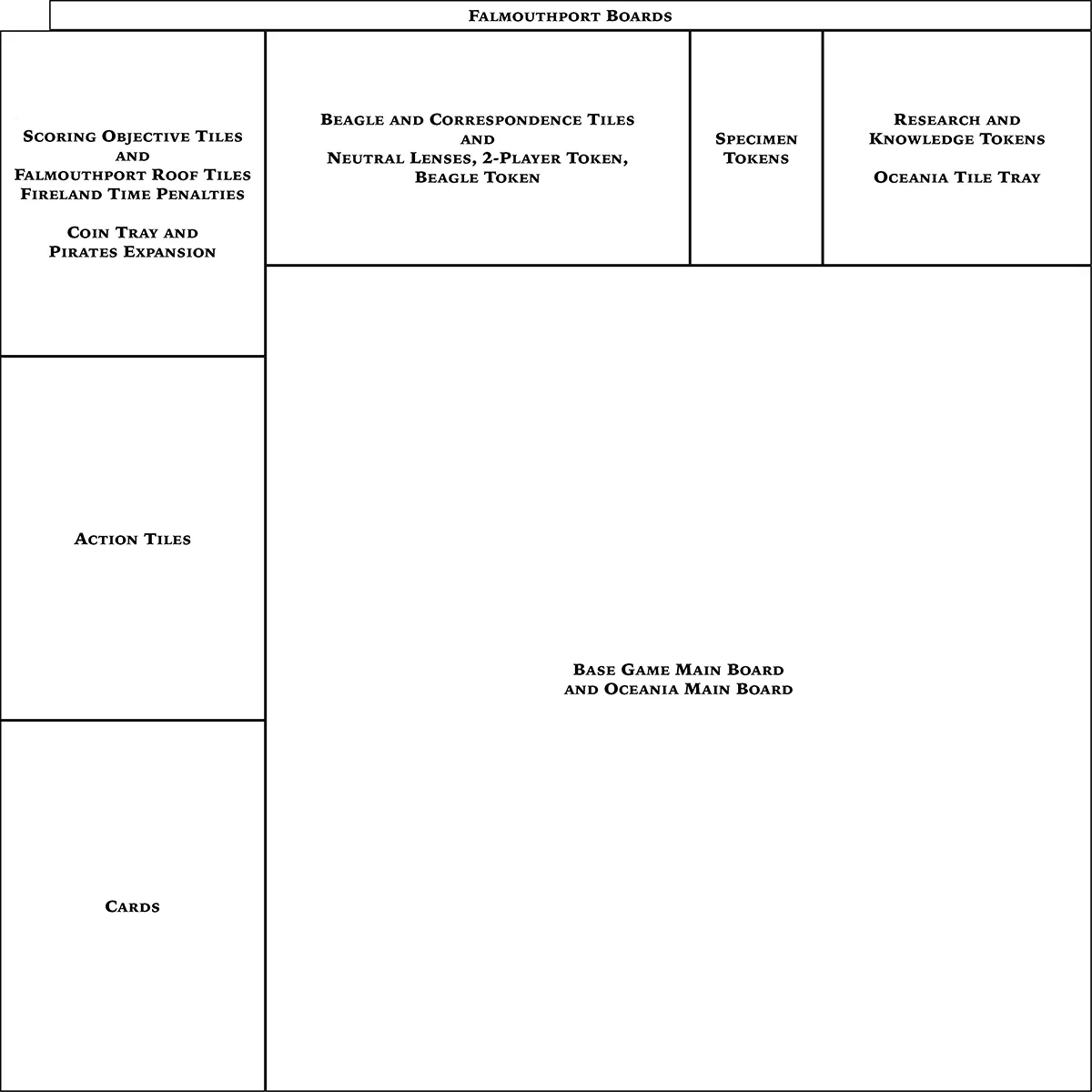 Organizer in 3D cho Darwin’s Journey: Collector’s Edition, hỗ trợ đầy đủ các expansion/mini-expansion (Fireland, Oceania, Pirates, v.v.). Tối ưu không gian trong hộp nhưng không phù hợp cho card đã bọc sleeve.