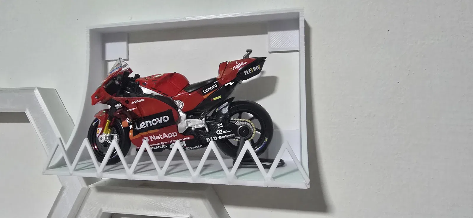Mình tìm kệ cho bộ sưu tập mô tô tỉ lệ 1:18 mà không thấy mẫu phù hợp nên tự thiết kế kệ này. Có bản có chốt và bản không chốt (cần keo), kèm miếng vuông để dán bằng băng keo hai mặt.