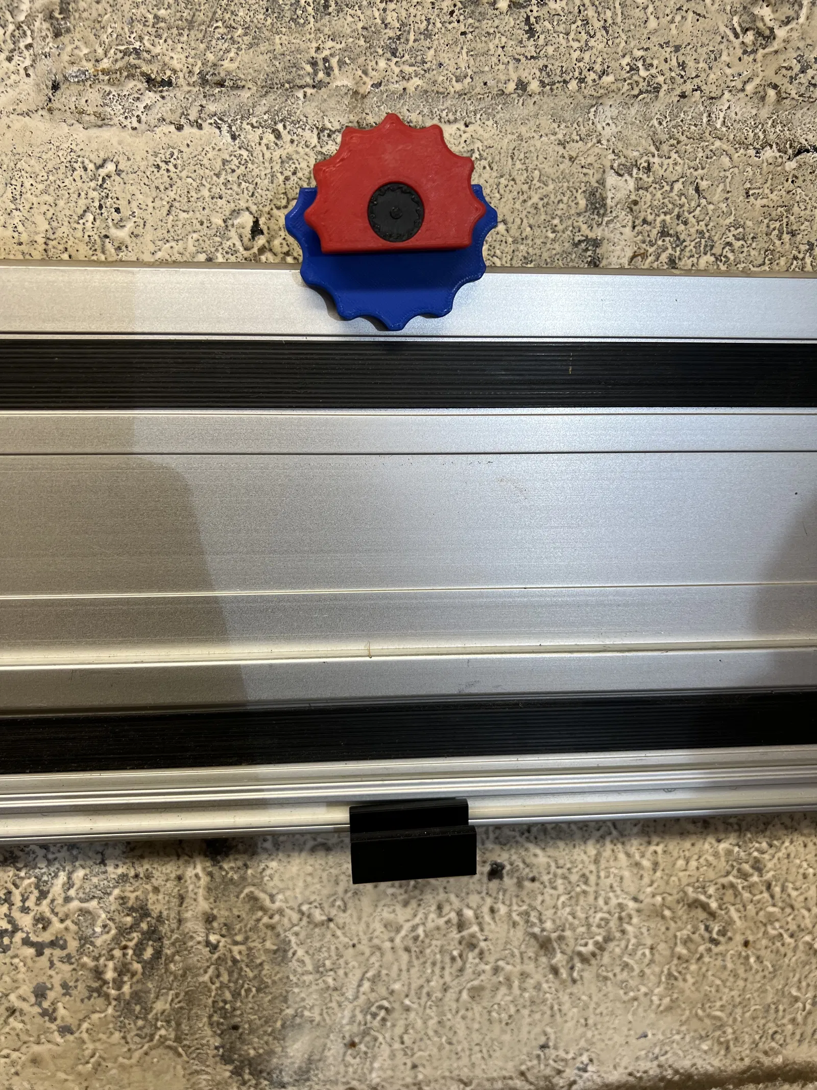 In ít nhất 2 cái để treo 2 thanh dẫn track saw lên tường, gọn gàng và tiết kiệm diện tích. Thiết kế 2 rãnh cho phép kẹp hai rail (trước/sau) với núm vặn để khóa hoặc nhả từng thanh.