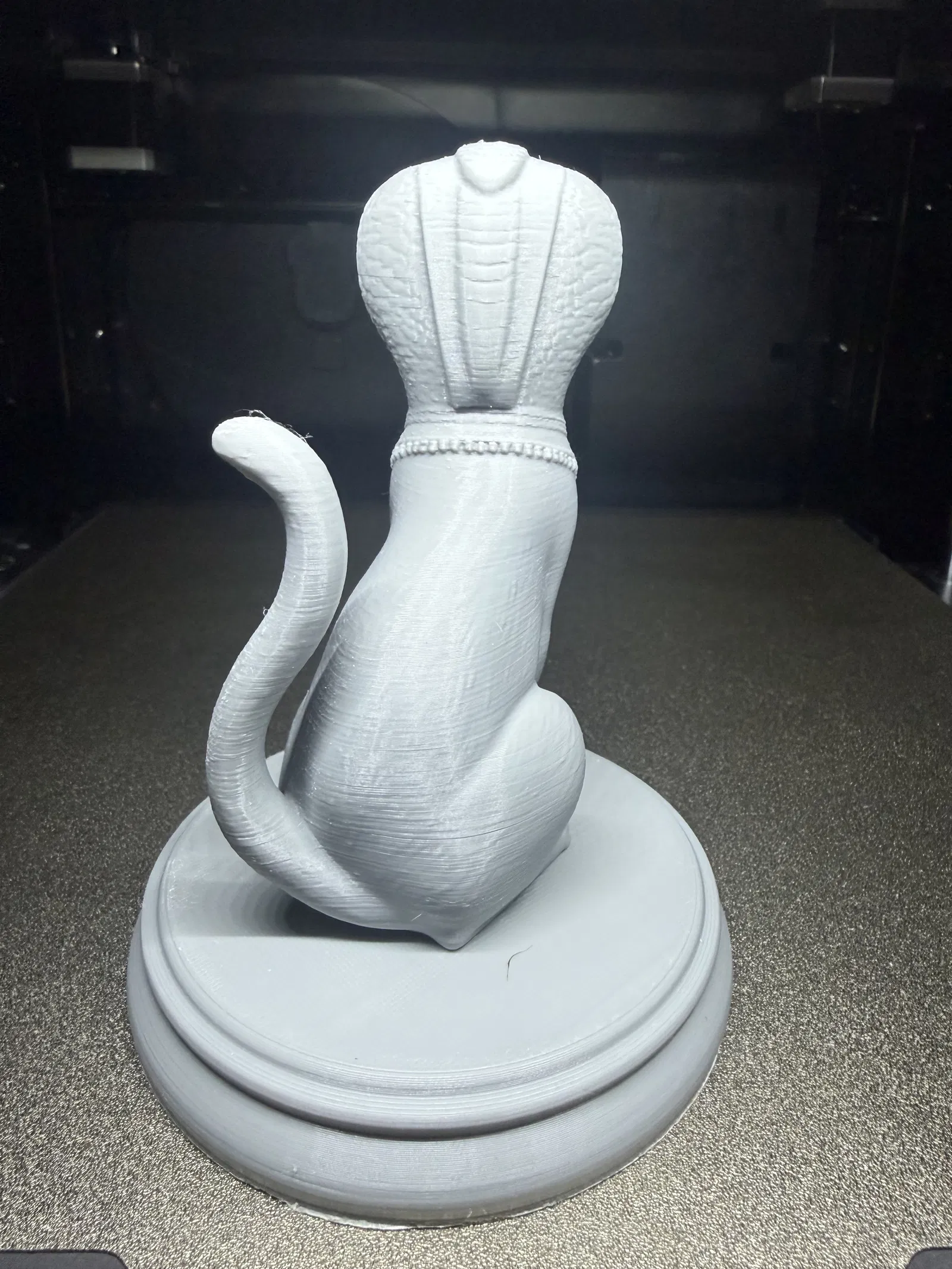 Tượng nữ thần mèo Ai Cập Bastet dáng ngồi uy nghi, mũ trùm cobra và trang sức tinh xảo. Thiết kế in FDM không cần supports, có bản có đế và không đế (2 file STL). Print tested trên Qidi X-Max 3.
