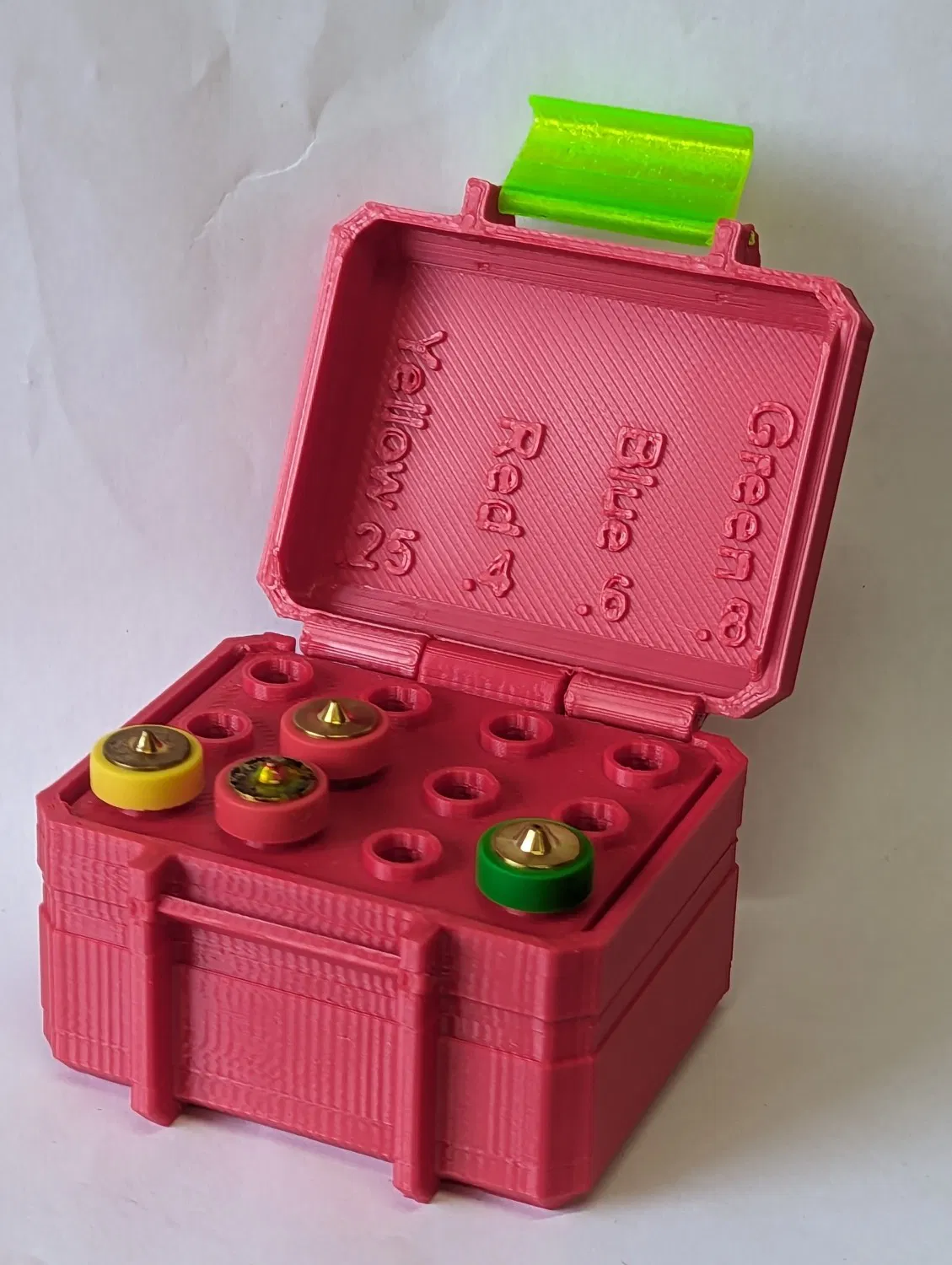 Một hộp để lưu trữ vòi phun E3D. Với nhãn và mã hóa màu cho 4 kích thước cơ bản, chứa 3 kích thước. Không biết về vòi phun vành đai dài hơn. Với vòi phun 0,4mm hoặc 0,6mm (hộp trong hình được in bằng vòi 0,6mm).