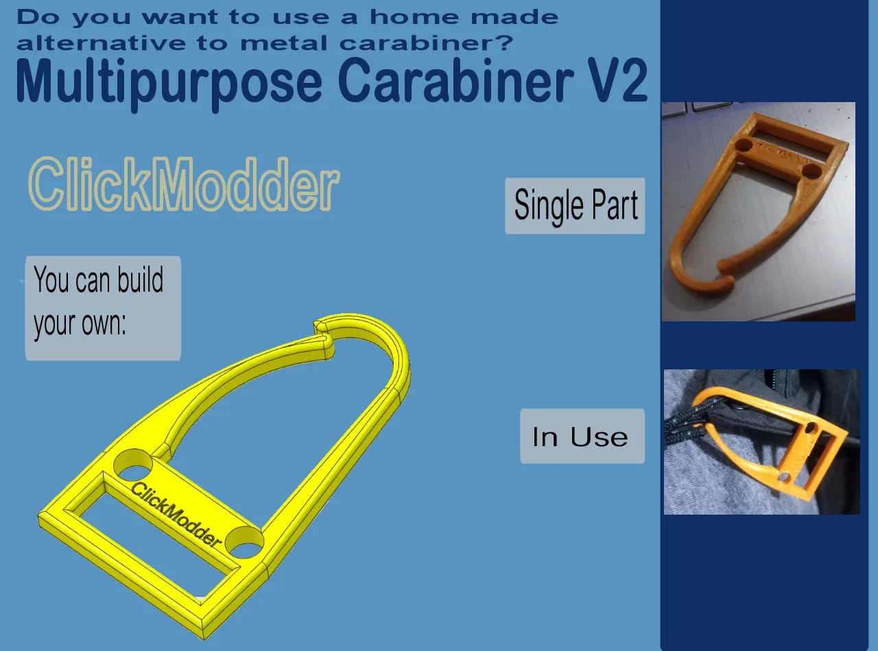 MultiPurpose Carabiner V2 là mẫu móc carabiner đa năng, tiện để kẹp và treo đồ hằng ngày như chìa khóa, phụ kiện hoặc gắn vào balo/dây đai. Thiết kế đơn giản, dễ in 3D và sử dụng linh hoạt.