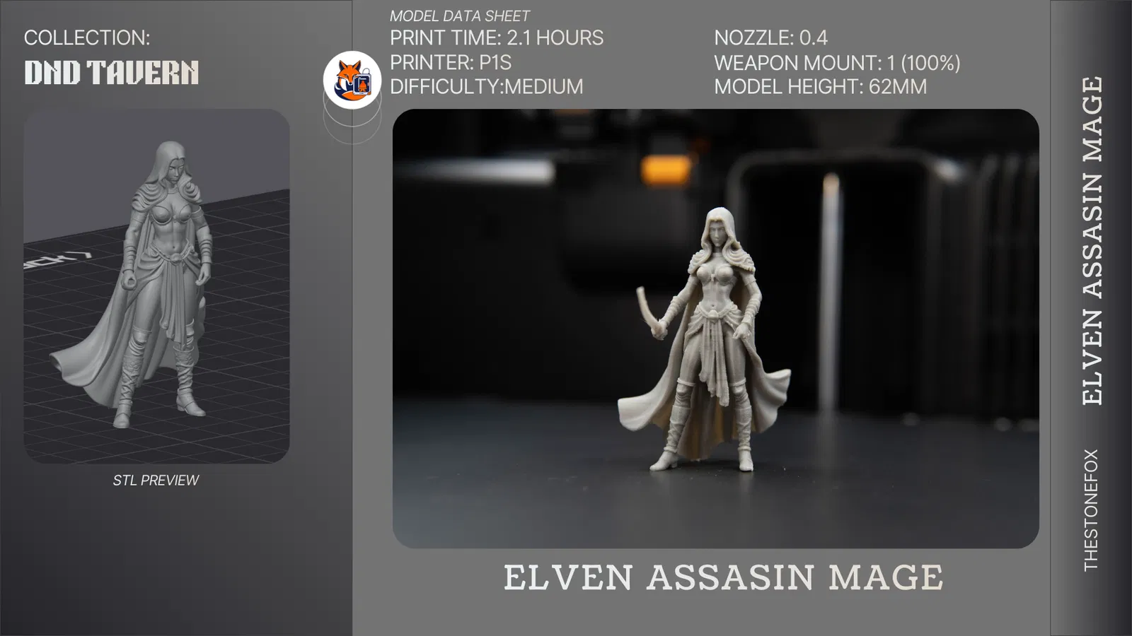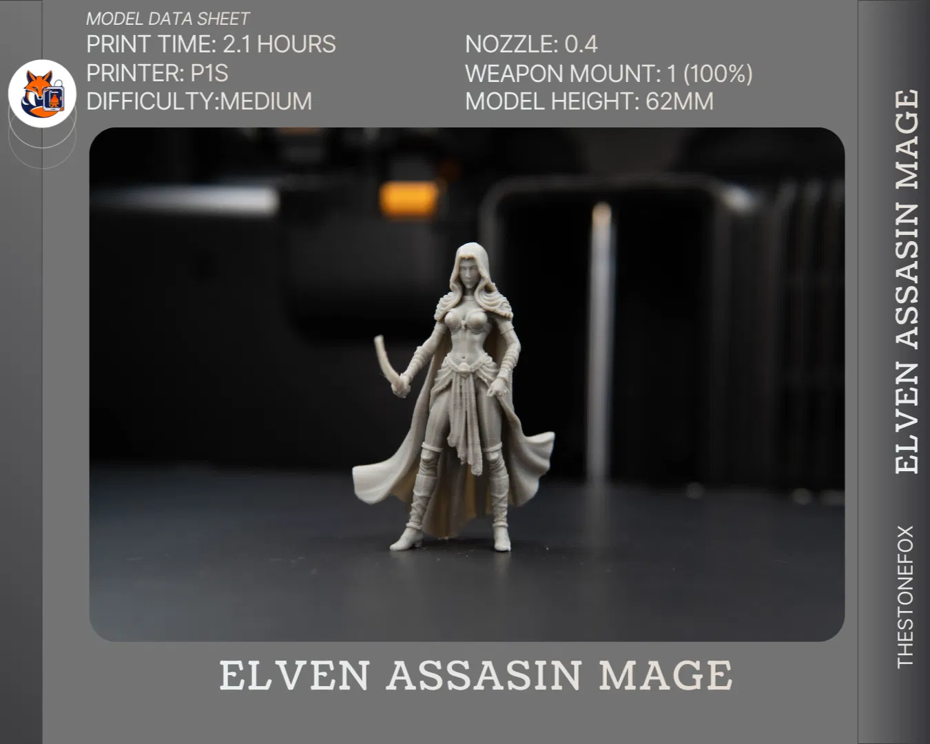 Mô hình Elven Assassin Mage này là một miniature D&D kết hợp khả năng ẩn mình (stealth) và sức mạnh arcane, tạo dáng sẵn sàng cho những đòn đánh nhanh, gọn và chí mạng. Thiết kế có bàn tay dạng modular với một lỗ để hỗ trợ gắn vũ khí hoặc hiệu ứng phép thuật có thể thay đổi. (link sẽ cập nhật sớm)