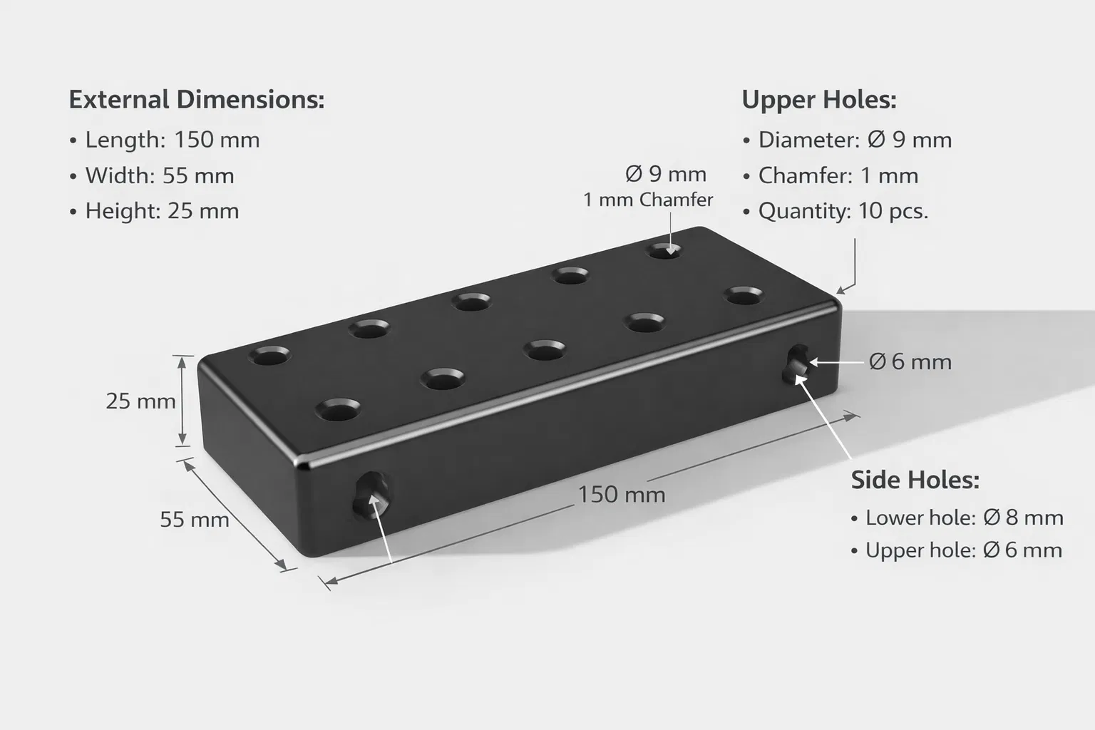 • Hoàn thiện: bo tròn bán kính 3 mm (R3) để an toàn và đẹp mắt.