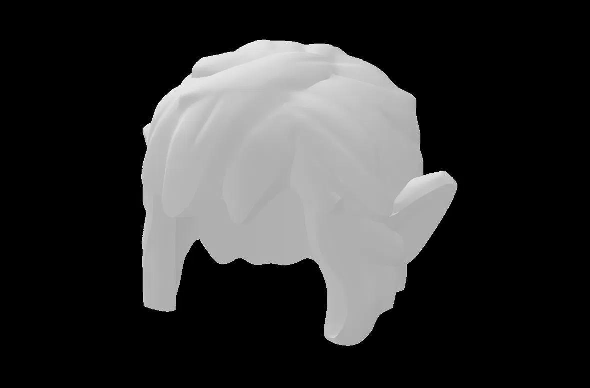 Mẫu 3D Lego Compatible (105002.dat) cho tóc minifig kiểu ngắn rối, có mái và đuôi ngựa, kèm pattern tai nhọn đúc sẵn. Thiết kế tương thích với hệ thống LEGO.
