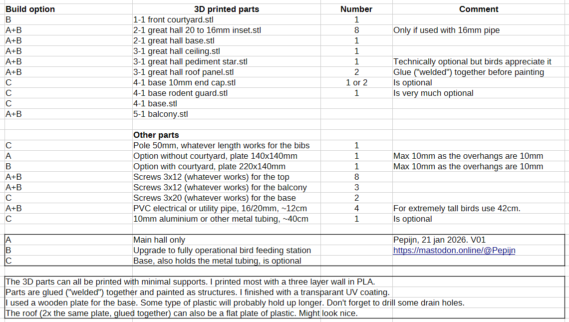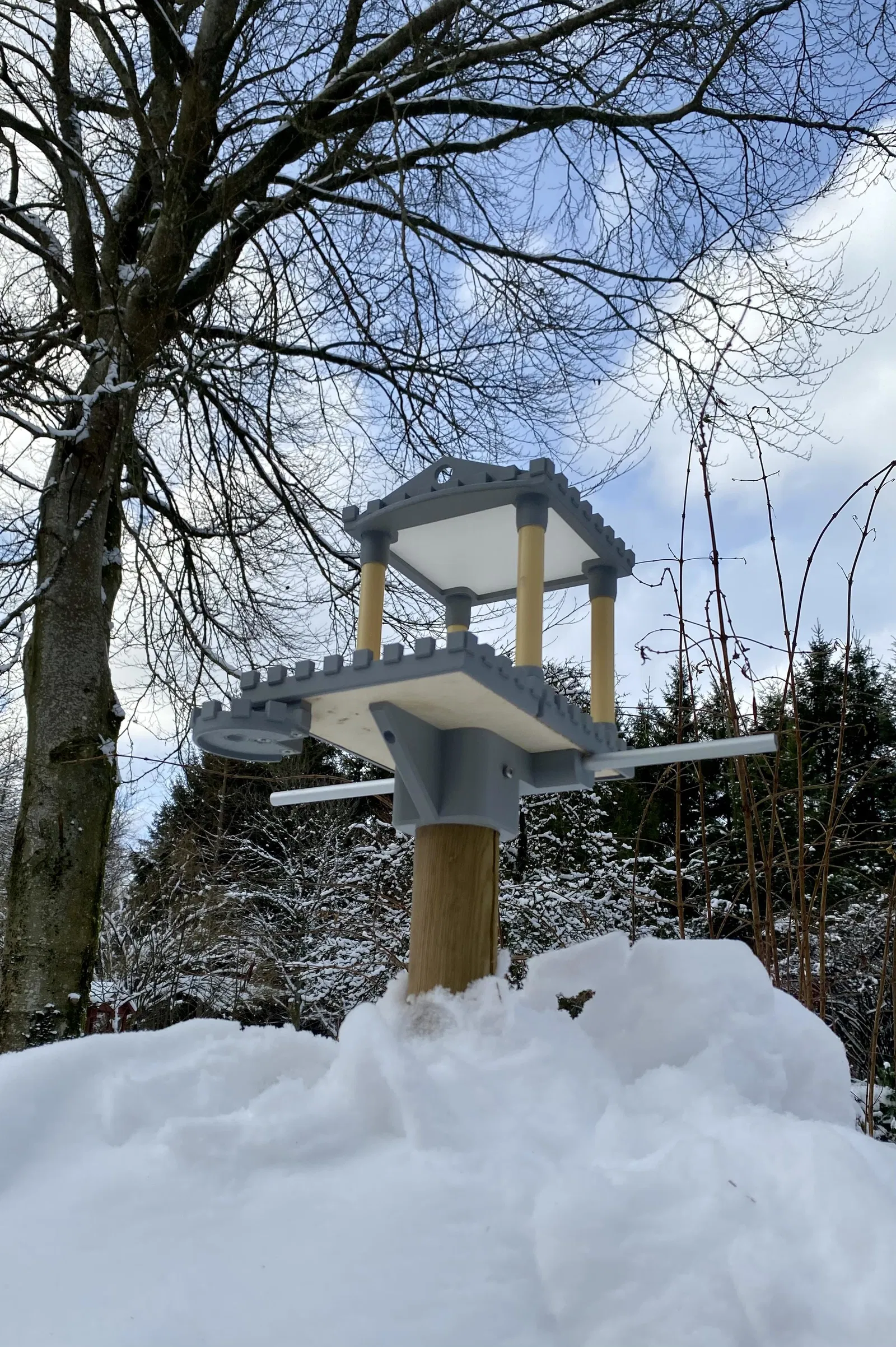 Máng ăn cho chim OpenBirdFeeder / BirdShitCastle3000 phong cách neoclassic La Mã pha Bauhaus, chống chịu thời tiết. Đế chắc chắn lắp vừa cọc 50mm. Có nhiều cách thi công; xem link Mastodon để biết hướng dẫn đầy đủ.