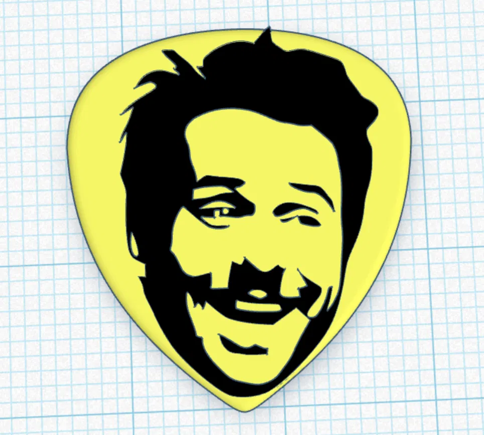 Miếng gảy đàn guitar có in khuôn mặt Charlie trong IASIP. Khuyến nghị in 100% infill với 5 walls để bền chắc; có thể gán màu trong slicer. Scale 115%–125% để hiện chi tiết rõ hơn.