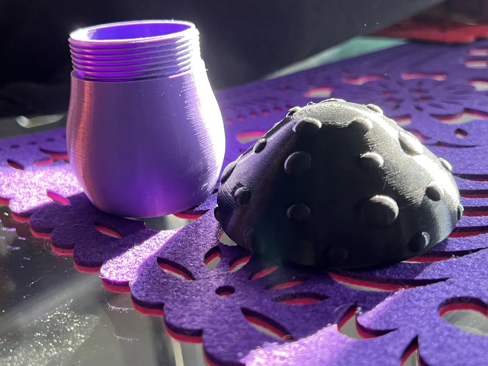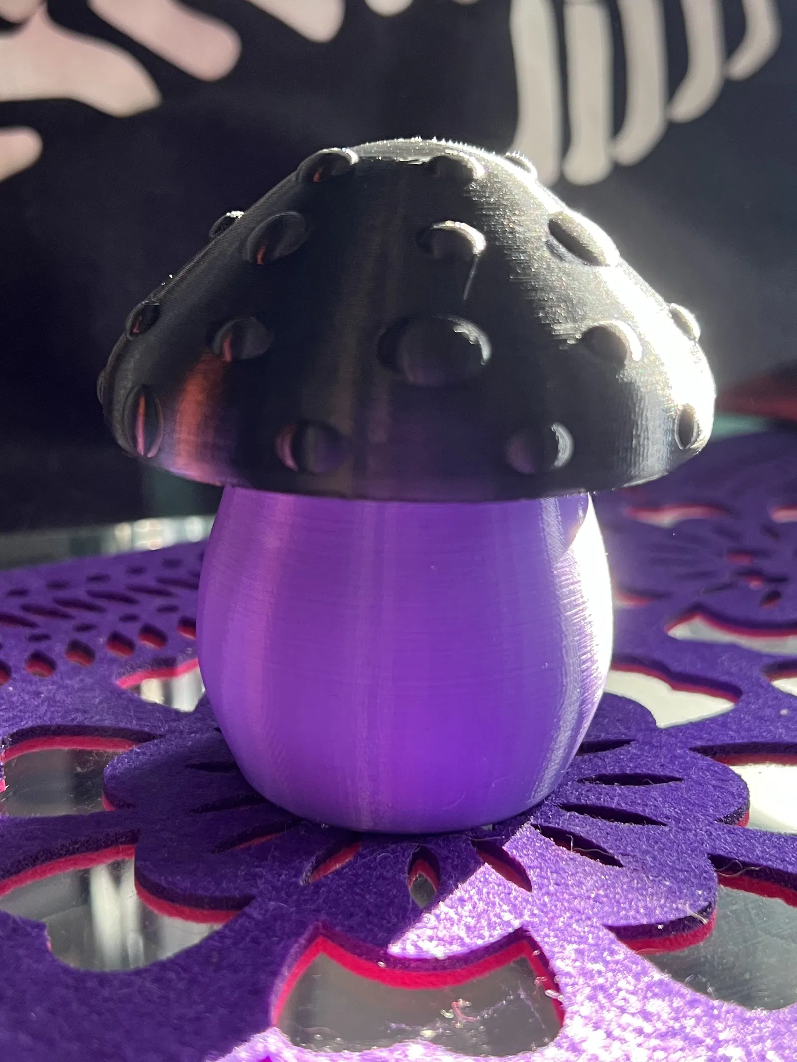 Hộp cất đồ hình nấm với nắp vặn ren. Thiết kế ren dài nên có thể vặn hơi lâu; khuyến nghị dùng bản remix vì ít vòng ren hơn, mở/đóng nhẹ tay và tiện hơn.