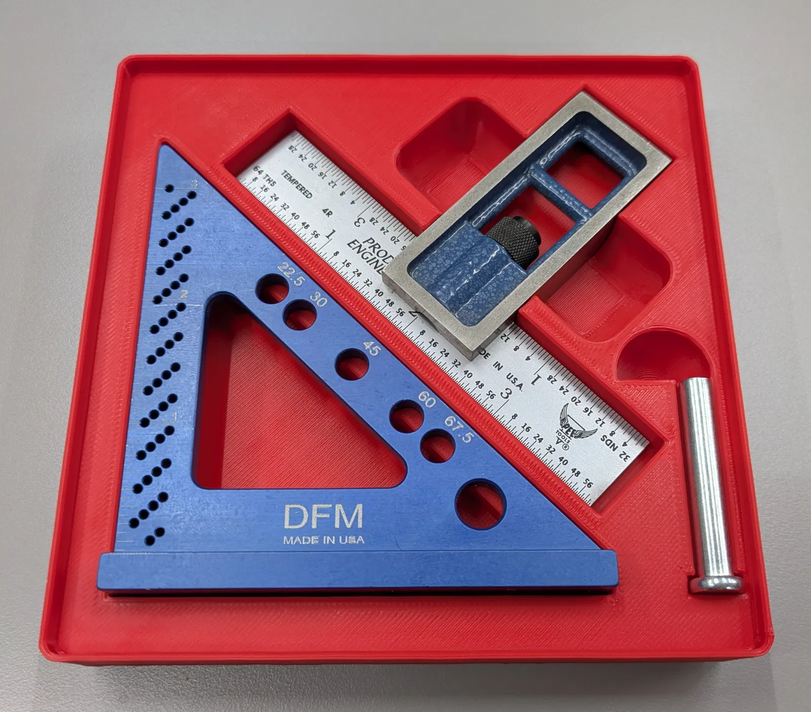 Khay lưu trữ Gridfinity 3x3 cho thước vuông thợ mộc loại nhỏ của DFM và thước double square của PEC Tools.
