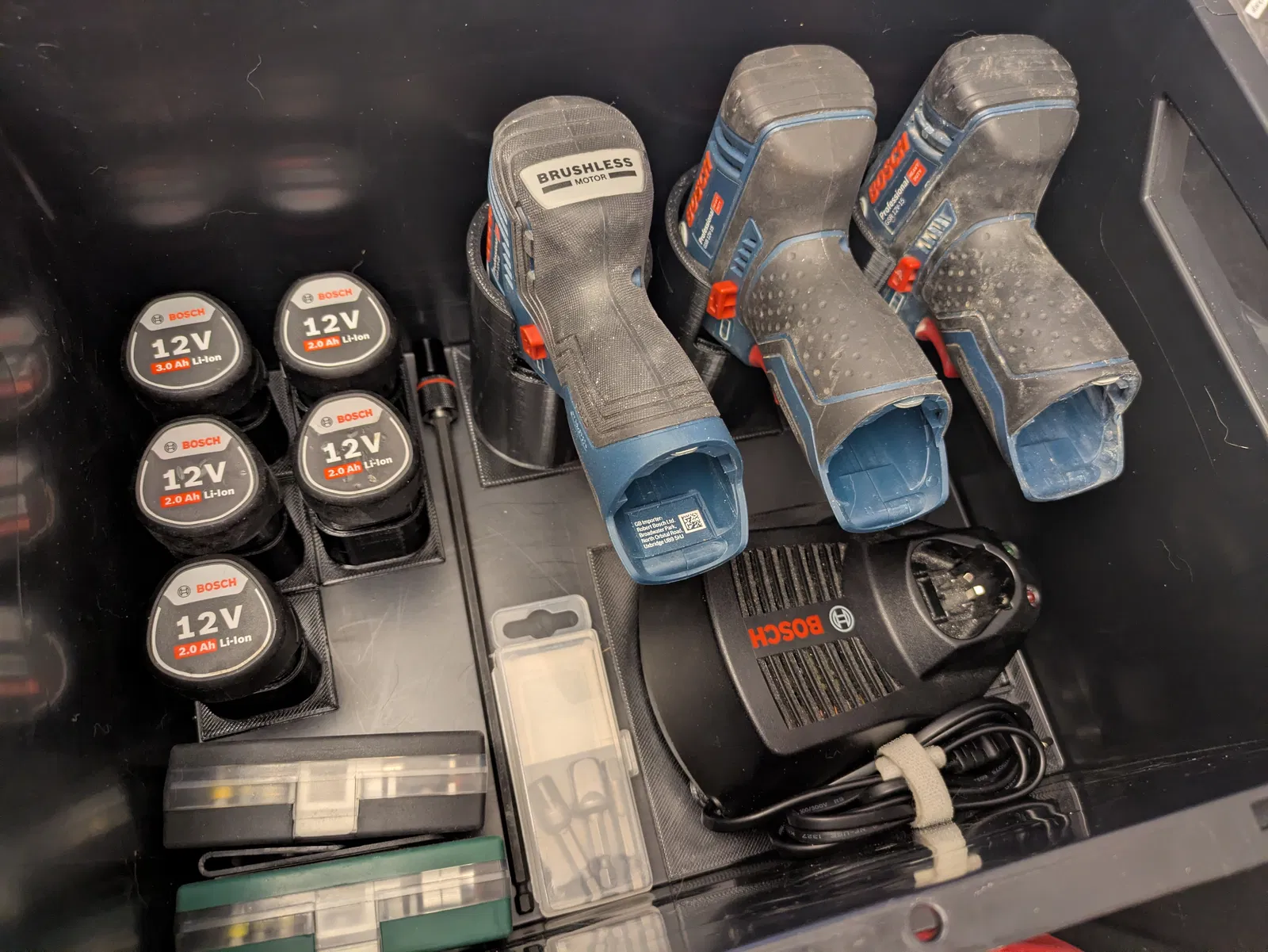 Bộ holder/mount dùng để cất gọn thiết bị Bosch Professional 12V gồm pin, máy khoan pin và bộ sạc trong Eurobox. Thiết kế phần kẹp máy khoan phù hợp nhiều model; in PETG để có độ flex, thông số in tham khảo kèm theo.