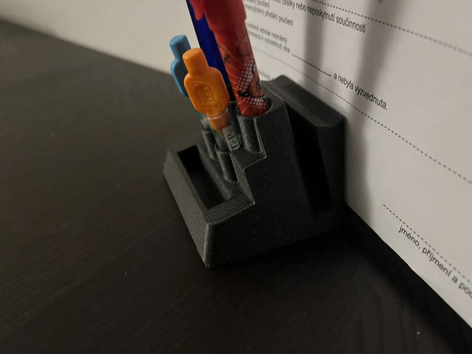 Một món gadget nhỏ để dùng trên bàn làm việc: vừa để giấy, vừa làm ống cắm bút/bút chì gọn gàng. Mình thiết kế cái này đơn giản để tặng vợ, tiện dụng cho góc học tập hay văn phòng.