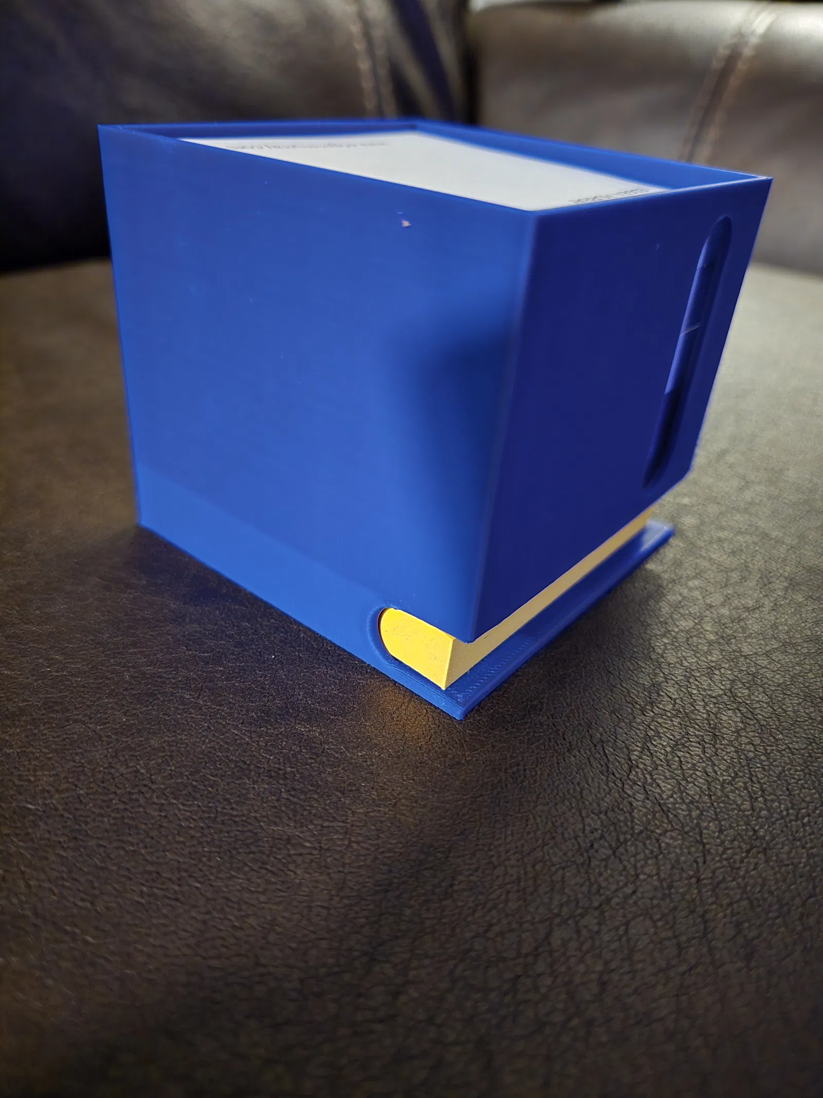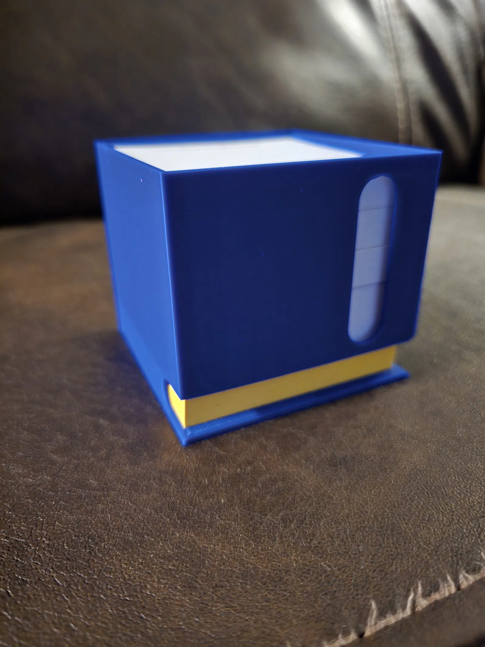 Khay nhả giấy Post-it nhỏ gọn, lấy từng tờ từ phía dưới, chứa được 6 xấp Post-it chuẩn 3×3 inch. Miệng mở dễ châm giấy, có cửa sổ bên hông để xem còn bao nhiêu. In bằng FlashForge Adventurer 5m.