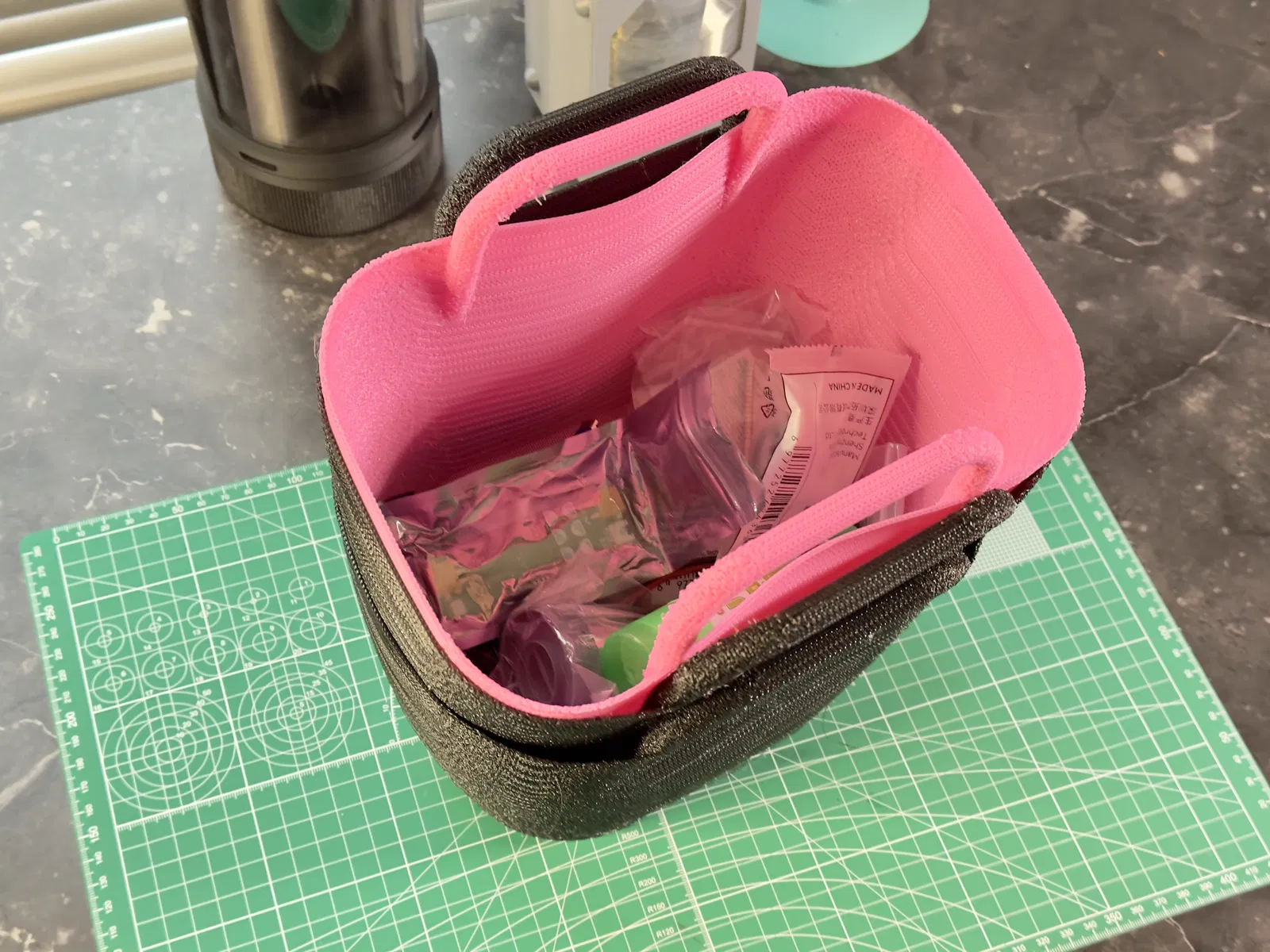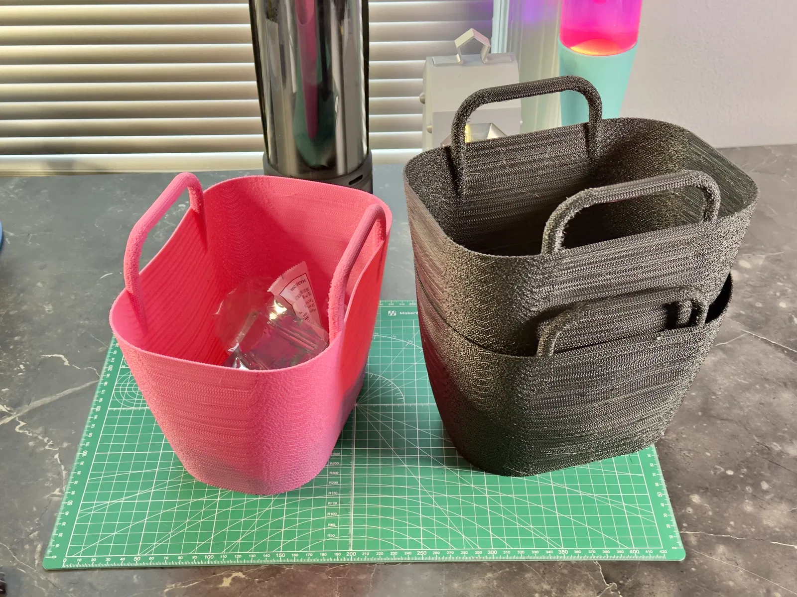 Bộ organizer dạng túi TPU xếp chồng, in theo kiểu “infill-only” để tạo bề mặt mesh bền và thoáng. Phù hợp phân loại dự án, gom đơn hàng nhỏ hoặc dọn gọn bàn làm việc. Infill 55% Gyroid, Walls/Top/Bottom = 0.