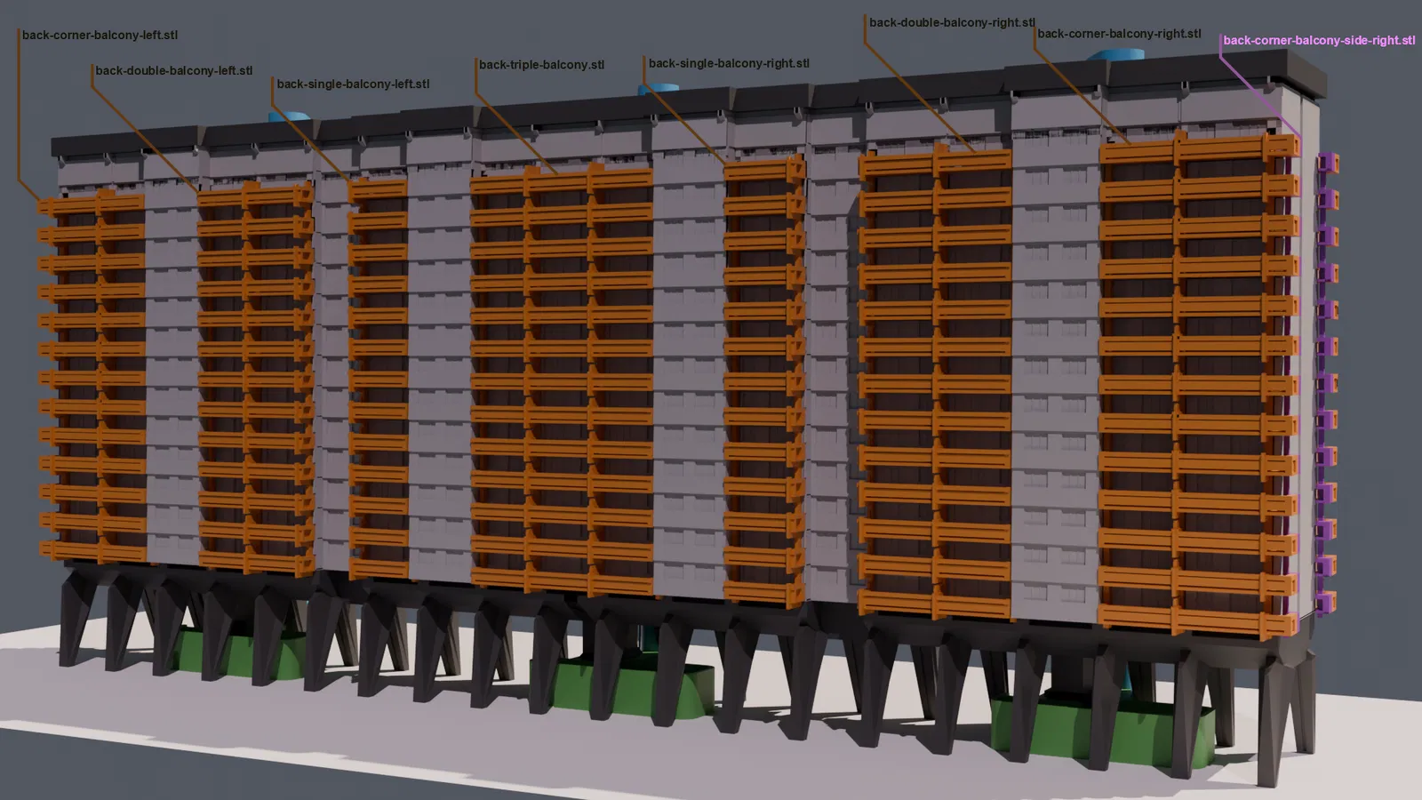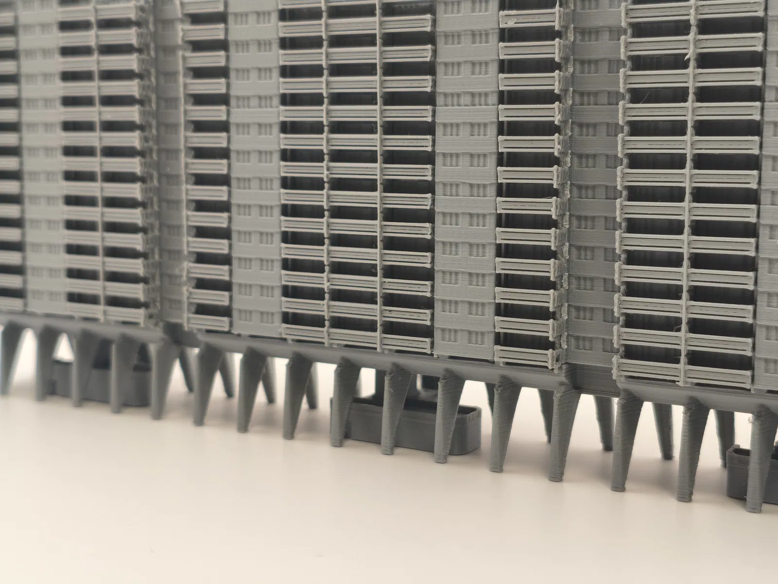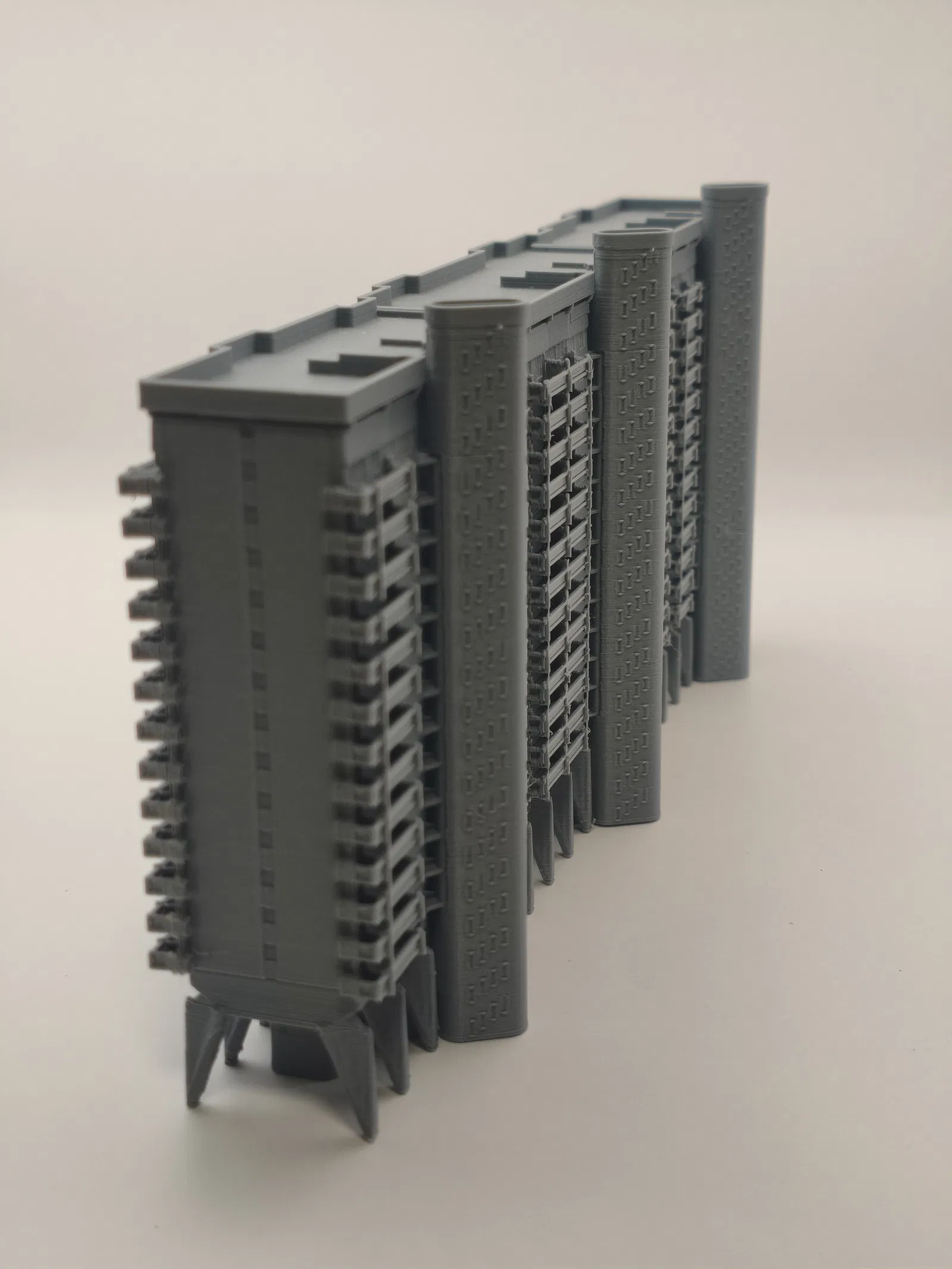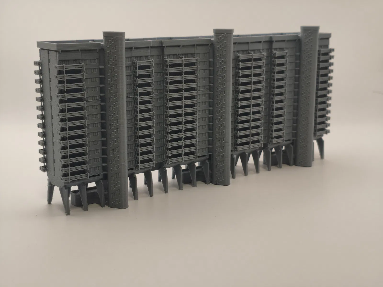 Bản in này có nhiều chi tiết phải lắp thủ công và dán keo lại với nhau. Nên bắt đầu từ phần ban công trước! Phần lớn các bước lắp ráp khá đơn giản, trừ mấy cái ban công. Ban công cần canh thật chuẩn theo các rãnh (grooves) trên phần thân chính của tòa nhà rồi dán vào. Mình làm bằng cách chấm vài giọt keo nhỏ lên từng cụm ban công, rồi canh và đặt lên tòa nhà thật cẩn thận. Sau đó đặt thêm vật nặng lên trên và để keo khô/cứng lại. Vì thân chính có rãnh nên khi đặt ban công vào thì nó sẽ kiểu tự canh tương đối; nếu không được thì có thể do bị artifact hoặc đường seam cấn vào.