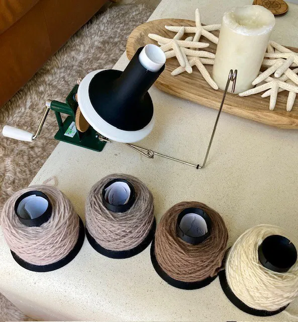 Skein được cất trên các cone, rồi gắn lên ribbon rack để yarn tuôn ra mượt khi đang đan.