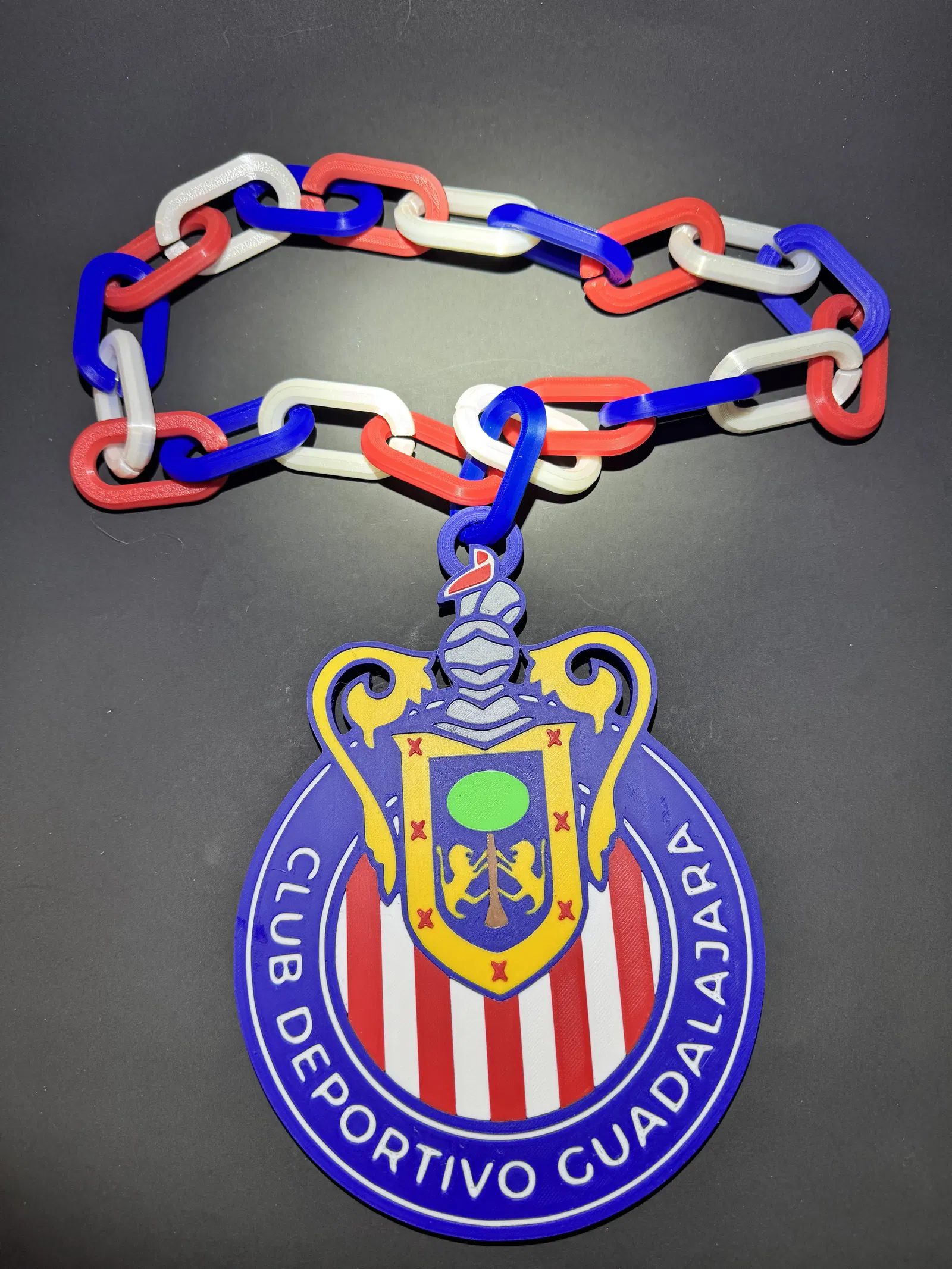 Mẫu dây chuyền (hype chain) Chivas Guadalajara cỡ lớn với logo nổi, có sọc đỏ và chi tiết xanh dương. In bằng PLA/PETG, nozzle 0.4mm, layer 0.2mm, không cần supports, cần AMS.