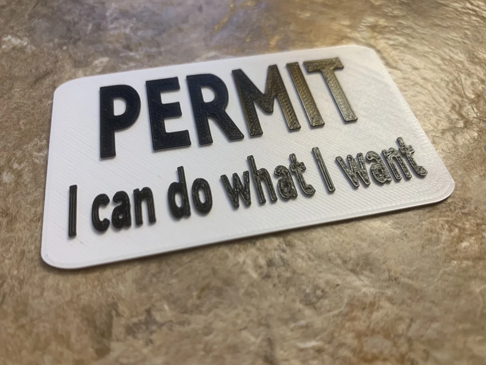 Khi ai đó bảo bạn không được làm gì, cứ đưa “Permit” ra như một lá bài reverse. Thiết kế vừa ví, góc bo tròn dễ sử dụng, chữ nổi hỗ trợ in 2 màu kể cả máy 1 nozzle. Ron approved.