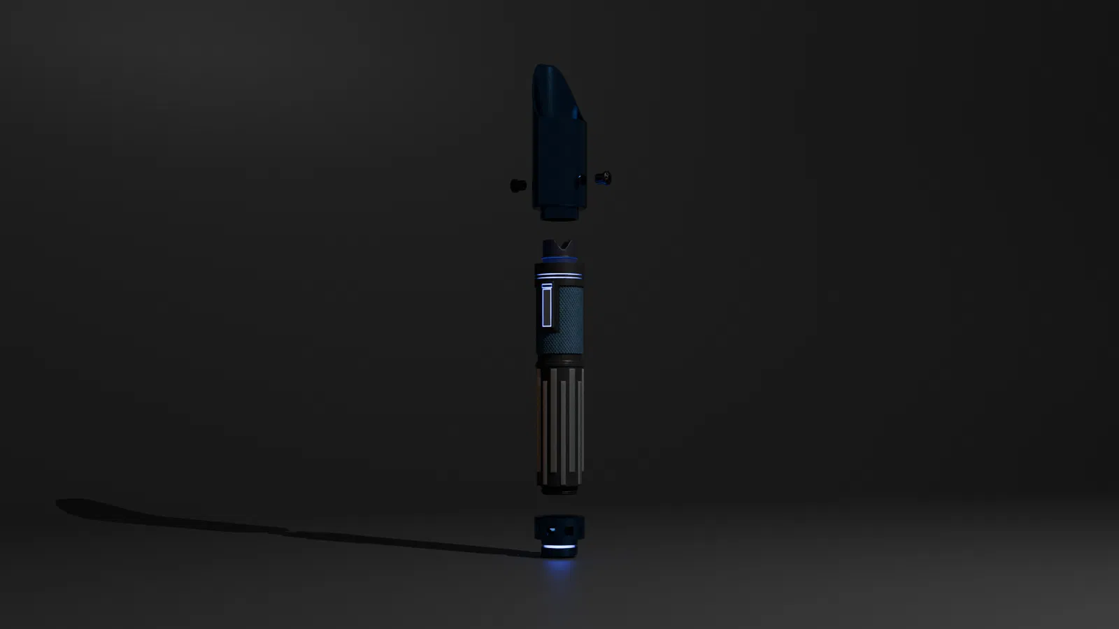 Mẫu tay cầm lightsaber nguyên bản (Cobalt) dùng làm prop hoặc game asset. Thiết kế có O-ring khuyên in bằng TPU, tuỳ chọn crystal window trượt vào cổ emitter, kèm adapter để lắp kiểu saberstaff.