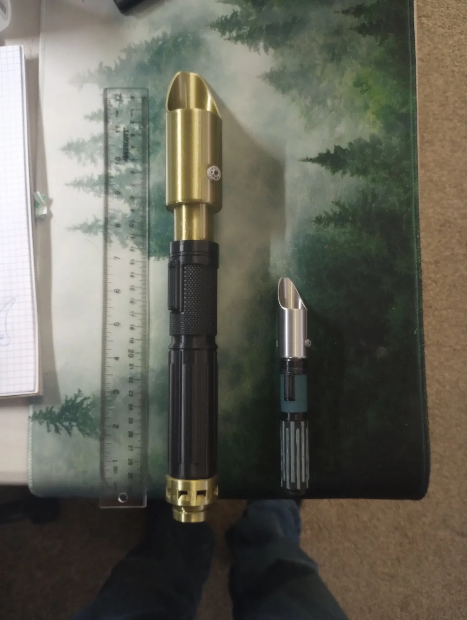 Đây là thiết kế thứ hai của mình trong series các lightsaber “original” mà mình dự tính sẽ làm. In phần O-ring bằng TPU. Phần cổ emitter nhìn hơi trống nên mình làm thêm một tuỳ chọn “crystal window” có thể trượt vào. Sau này chắc mình sẽ thiết kế bản chi tiết hơn. Mình cũng làm thêm một adapter để dùng theo kiểu saberstaff.