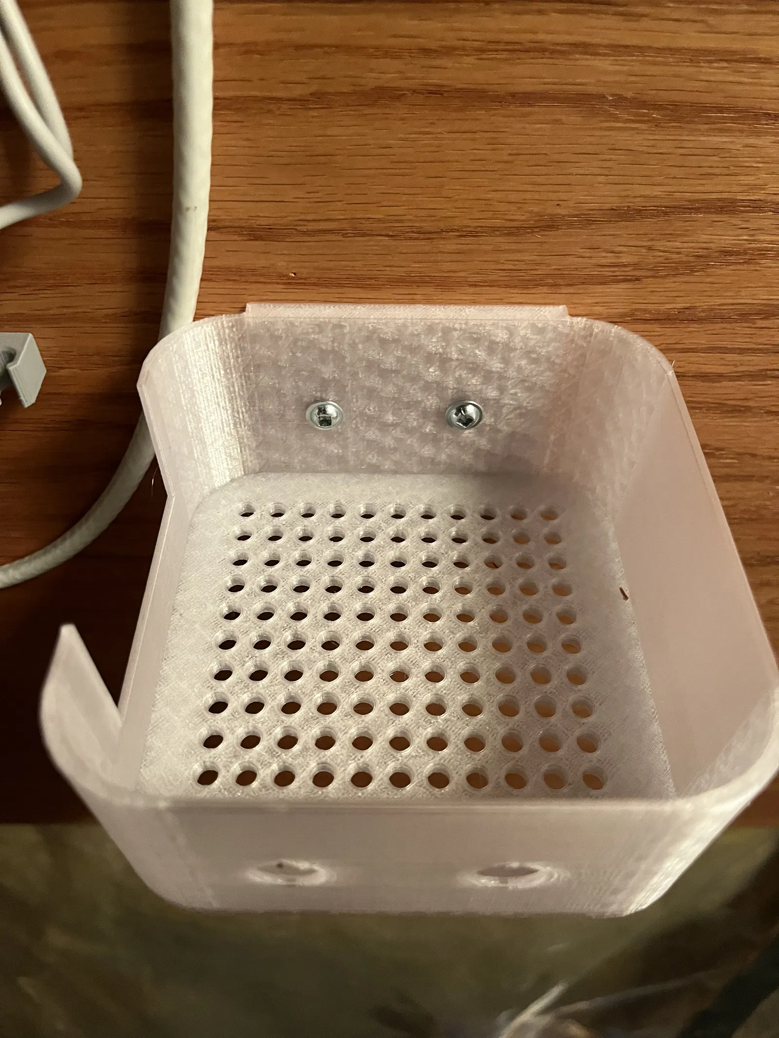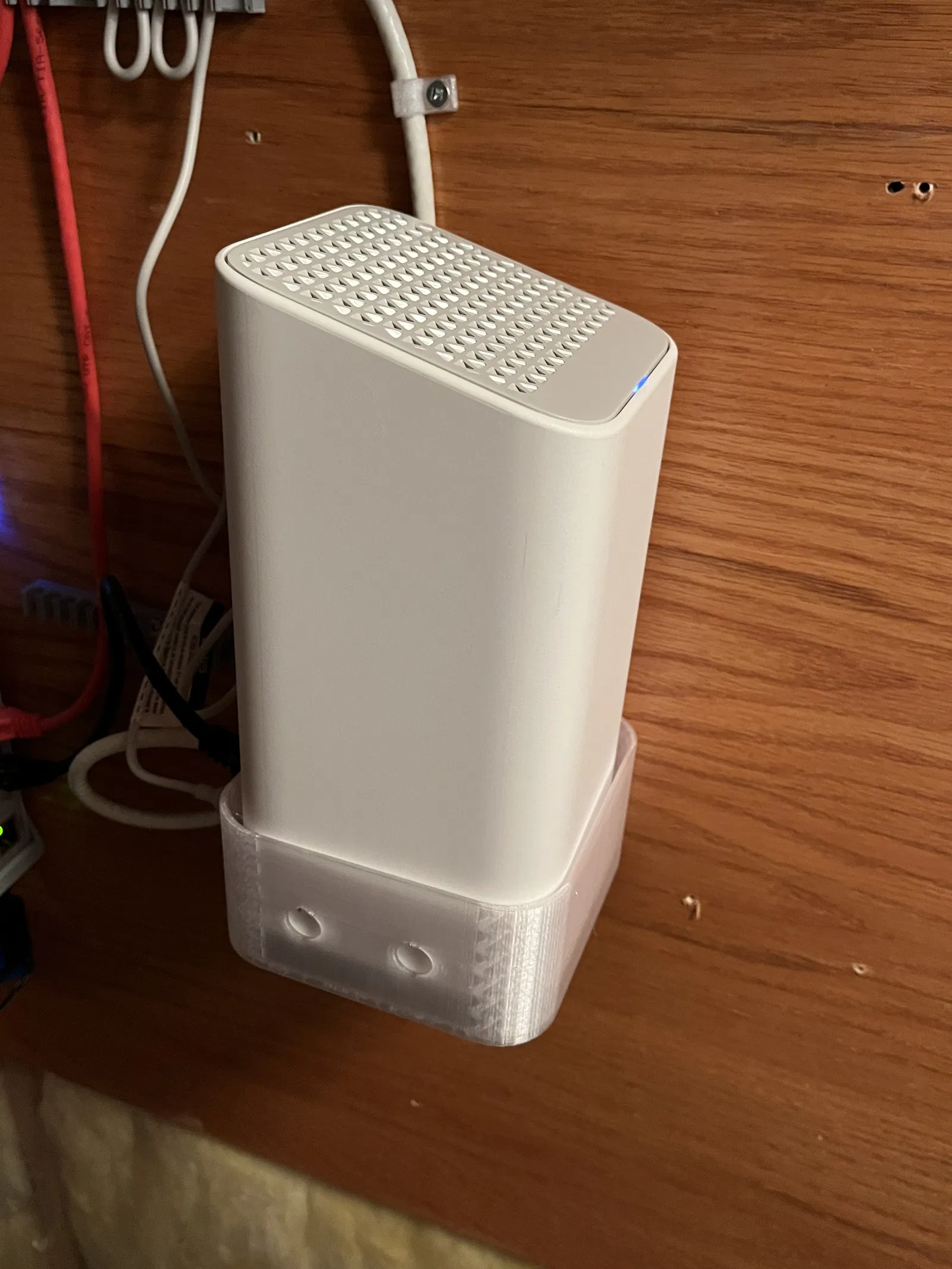 In bằng PETG, infill 20%, không cần supports. Gợi ý thêm cylinder modifier quanh các lỗ vít để gia cường phần bắt tường, hoặc tăng mật độ infill. Mẫu được thiết kế hơi lớn hơn modem để thoáng khí, và có sẵn các lỗ thông gió ở mặt đáy.