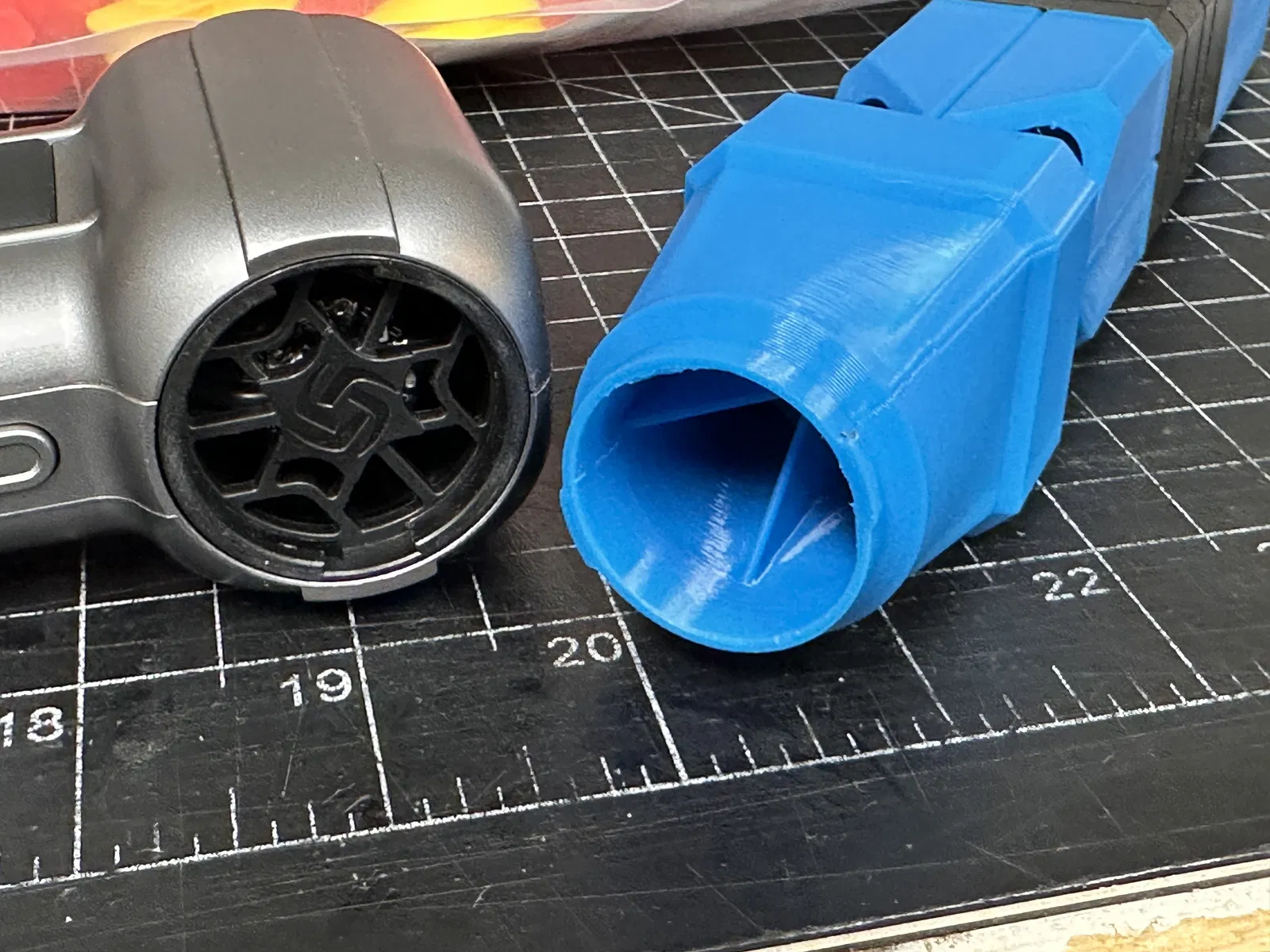 In cái mouthpiece này trước — rồi qua mẫu Train Whistle toy in 4 cái whistle. Bạn có thể in luôn cái phần để giữ 4 cái lại với nhau, hoặc như mình: lười chút, quấn băng keo điện quanh chúng. Sau đó gắn nozzle này vào MF100, đẩy mấy cái whistle vào, rồi quậy thôi. Ở mức thấp nhất, bạn sẽ nghe tiếng quạt hơi bị “đuối” do backpressure, nhưng ở mức cao nhất thì… cảnh báo trước: khá là to! Không tới mức gây hại thính giác, nhưng rất là dễ nhận ra. Rất hợp làm đồ tạo tiếng ồn ở các sự kiện thể thao, dù máy thổi khởi động và dừng lại hơi chậm.