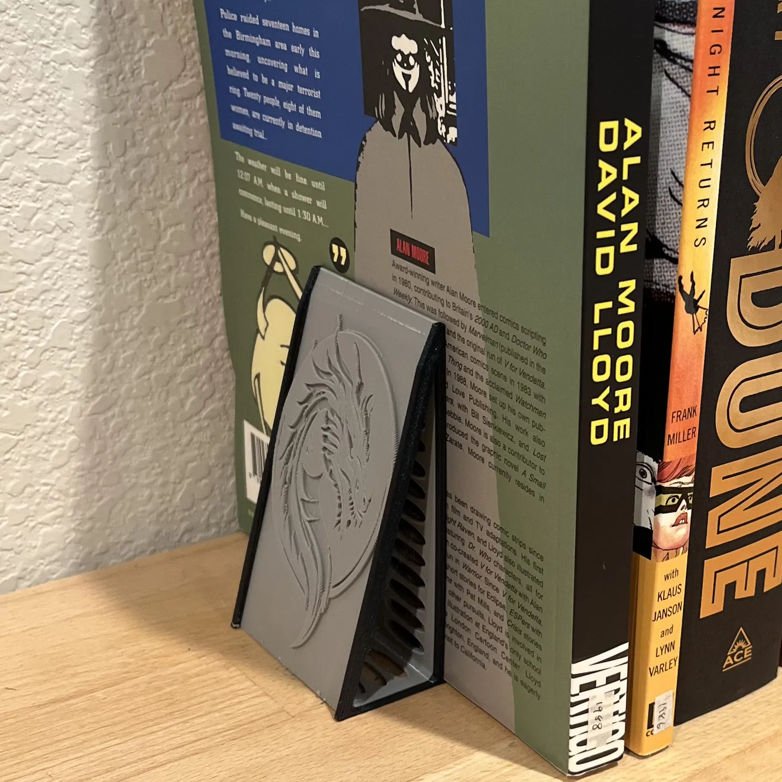 Mình cứ bị bực cái bộ truyện tranh VforVandetta hay bị té ngã hoài, nên mình làm mẫu này để giữ nó, đồng thời đỡ luôn mấy cuốn sách khác đang để đứng tự do.