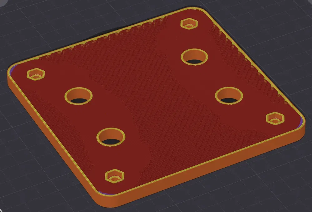 Adapter VESA 100x100 cho màn hình Samsung Odyssey G6/G7/G8 khi bị thiếu ngàm zin. Thiết kế tối ưu infill: 100% ở đường chịu lực, 15% phần còn lại; in PLA-CF cứng vững, đủ sức đỡ màn hình trên 20kg.