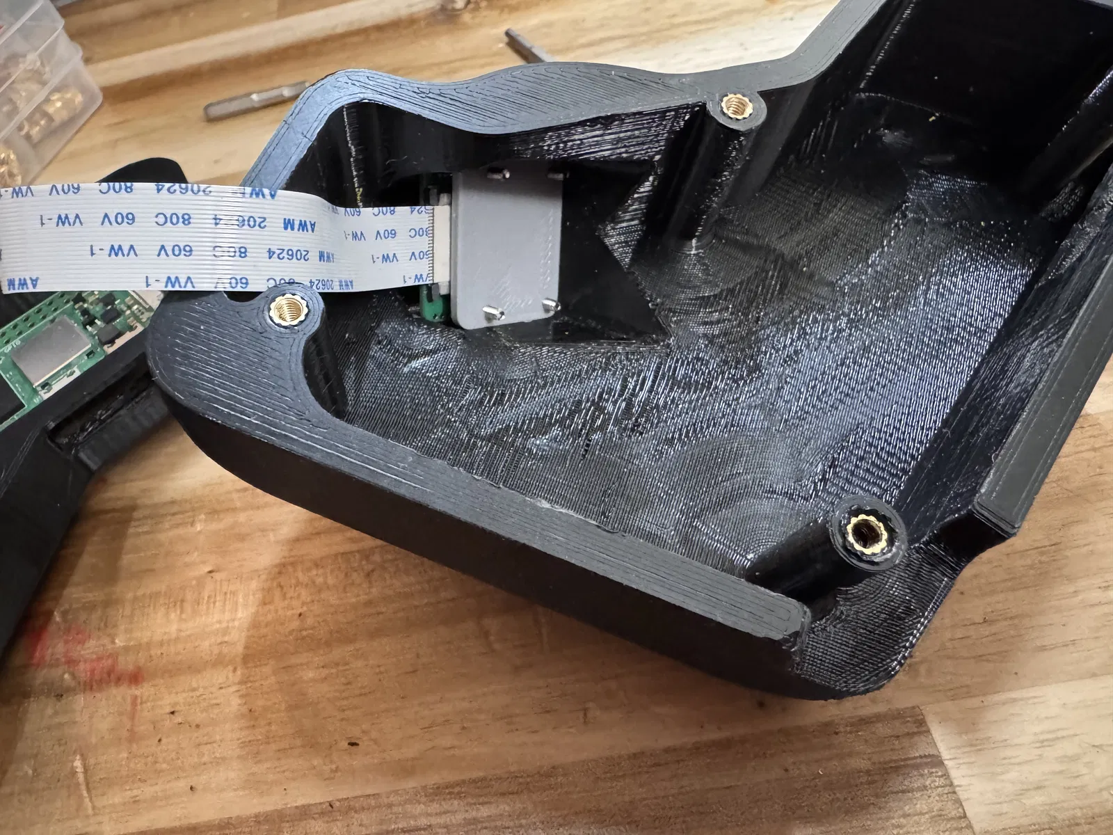 Mình in tất cả bằng PETG và dùng PLA cho supports. Raspberry Pi Zero 2W được giữ bằng ốc M2.5 vặn trực tiếp vào nhựa, còn module camera được giữ bằng ốc M2 vặn trực tiếp vào nhựa.