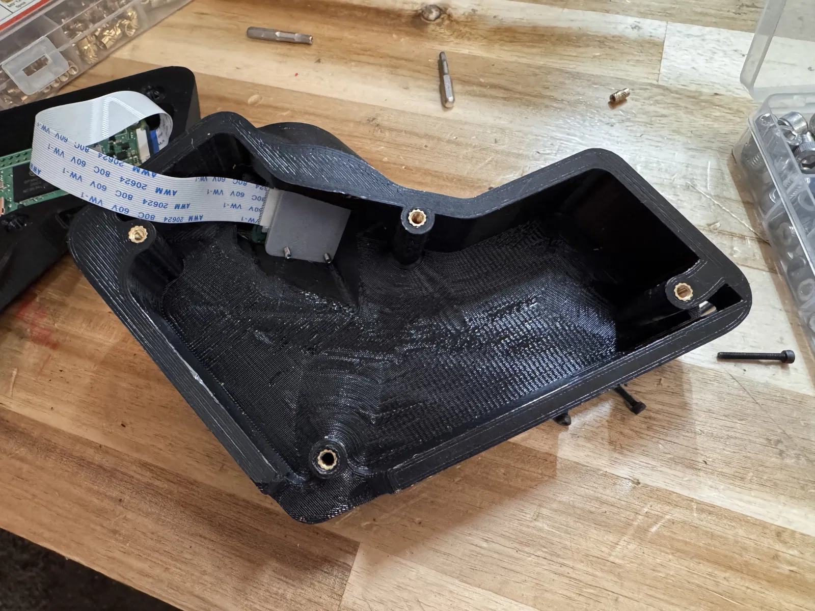 Thiết kế gốc rất hay, nên vô coi bản gốc trước nha. Mình chỉ cắt bớt vừa đủ ở cả hai nửa để chúng nằm phẳng trên build plate, nới rộng các lỗ bắt cho M3 heat set inserts, nới rộng lỗ bắt đơn giữ camera vào enclosure để dùng M4 heat set, thêm vài phần extrusions vào 3 trong 4 standoffs vì lúc mình tháo supports lần đầu khi in nửa phía camera thì chúng bị gãy, và nới rộng lỗ USB passthrough ở phía Pi của vỏ.