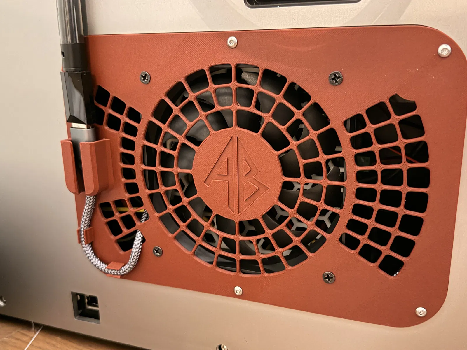 Backplate này sẽ gắn được quạt 120mm để làm mát Main Board và các stepper motor trục X/Y. Nó cũng cho phép luồn một USB extender qua một lỗ, đi dây qua hai cái kẹp (clips), rồi kết nối với một WIFI dongle mới.