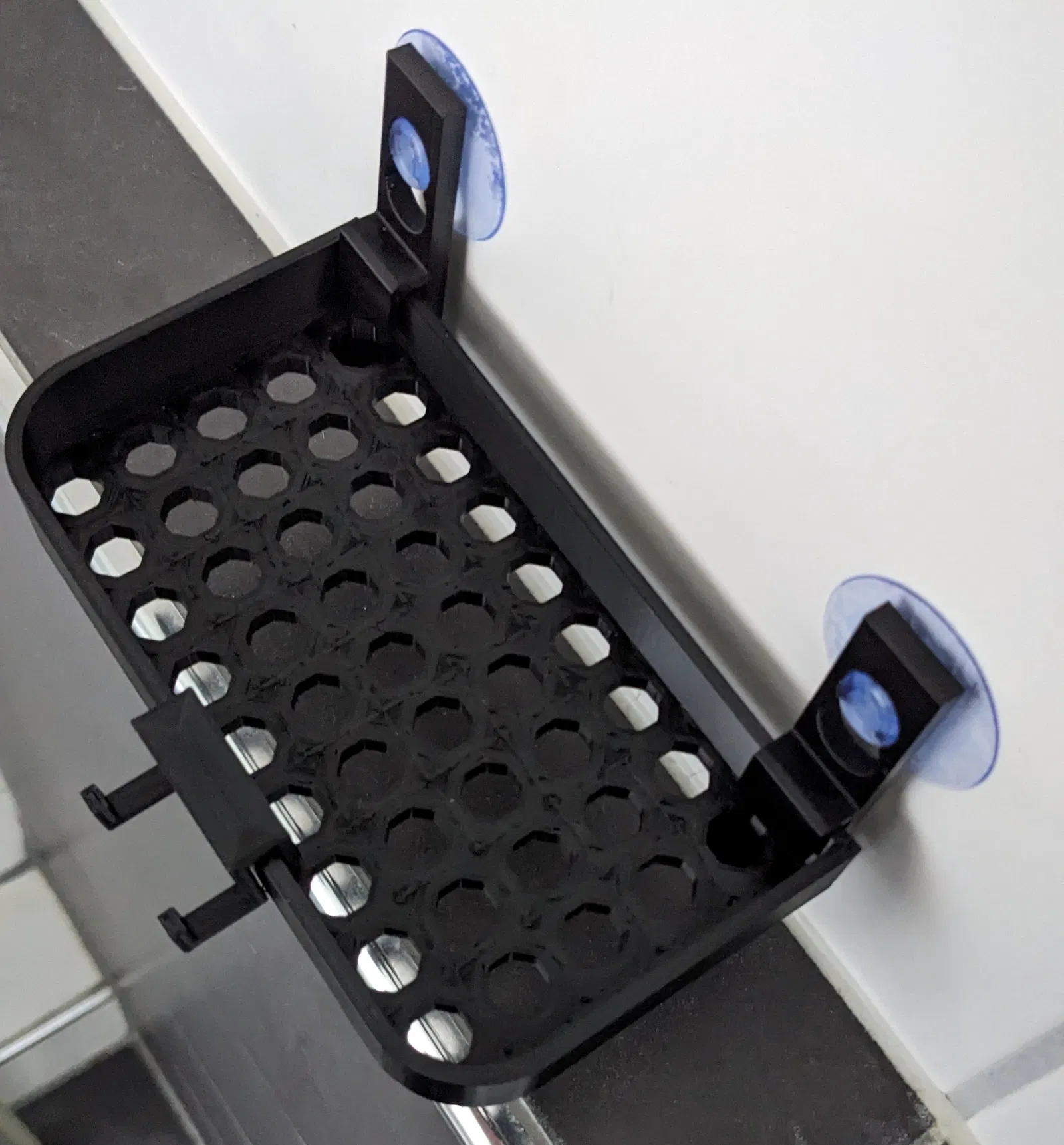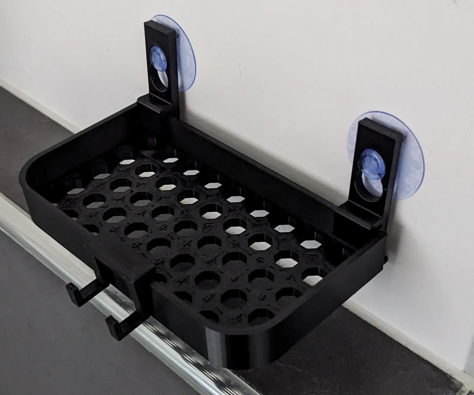 Khay để đồ trong vòi sen khi đi du lịch, giúp đặt sữa tắm/dao cạo gọn gàng thay vì để dưới sàn. Thiết kế gấp gọn, dùng với 2 holder kèm suction cup hoặc kẹp vách ngăn; có thể thêm holder cho dao cạo.