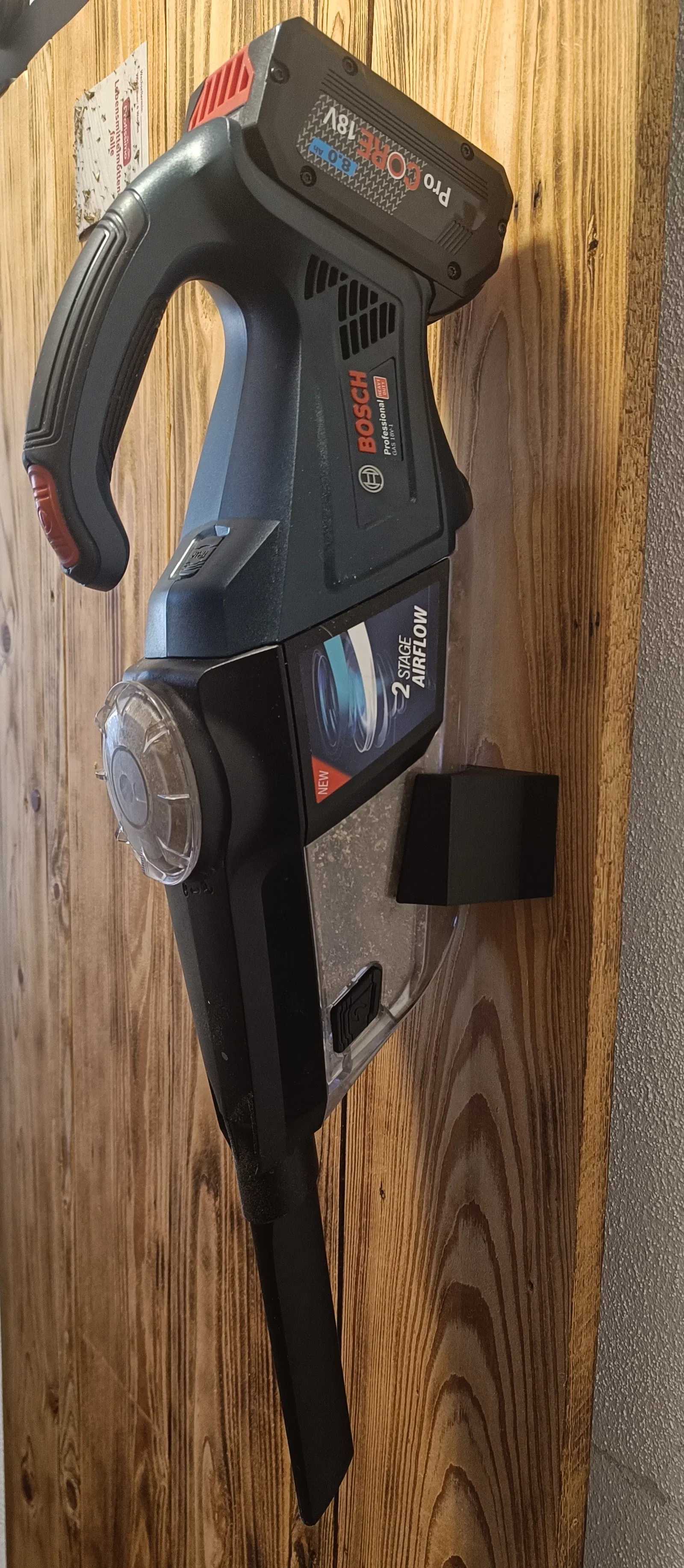 Wall mount đơn giản, chắc chắn để treo máy hút bụi Bosch GAS 18v-1 gọn gàng, khuất sau cửa trượt. In đẹp với PETG (PLA cũng được), 3 walls, 15% grid infill, không cần supports. Có file FreeCAD để tuỳ biến.