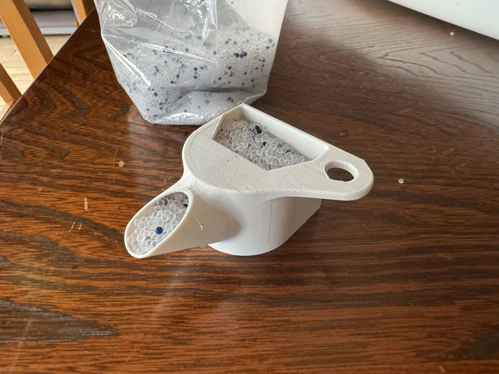 Phễu dạng muỗng giúp xúc và đổ silica gel hoặc hạt hút ẩm vào hộp/chai nhanh gọn, ít rơi vãi. Model in dễ, không cần support từ slicer, có support tích hợp tháo rời và có thể scale theo kích thước miệng bình.