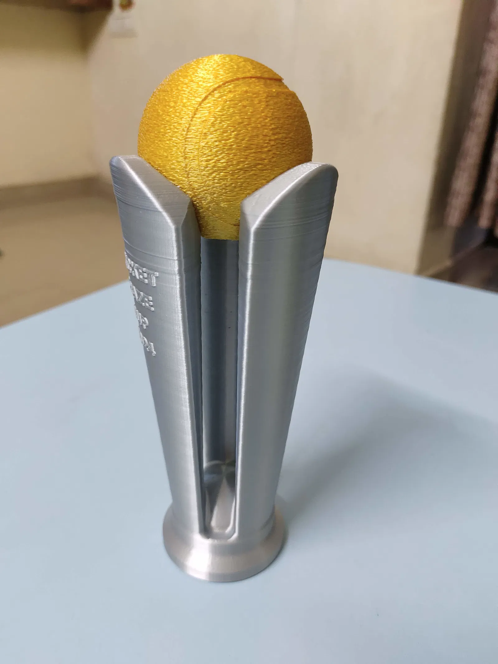 Mẫu cúp Turf Cup gồm 2 phần, thiết kế bằng Fusion 360 và tối ưu để in PLA. Thân cúp in không cần supports; bóng tennis dùng Tree Supports và có thể bật Fuzzy Skin trong Cura để bề mặt giống bóng thật. Dán ráp đơn giản.