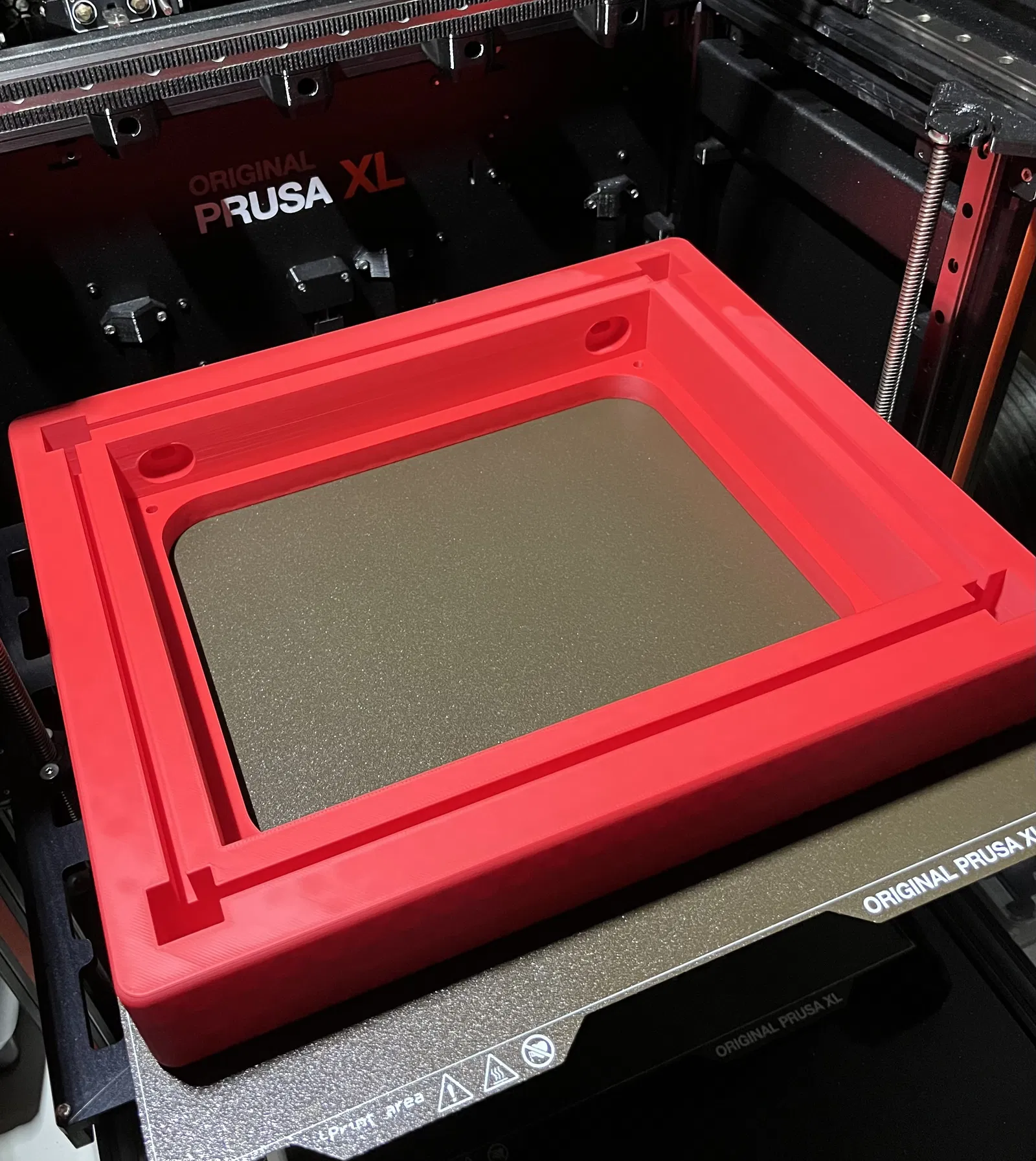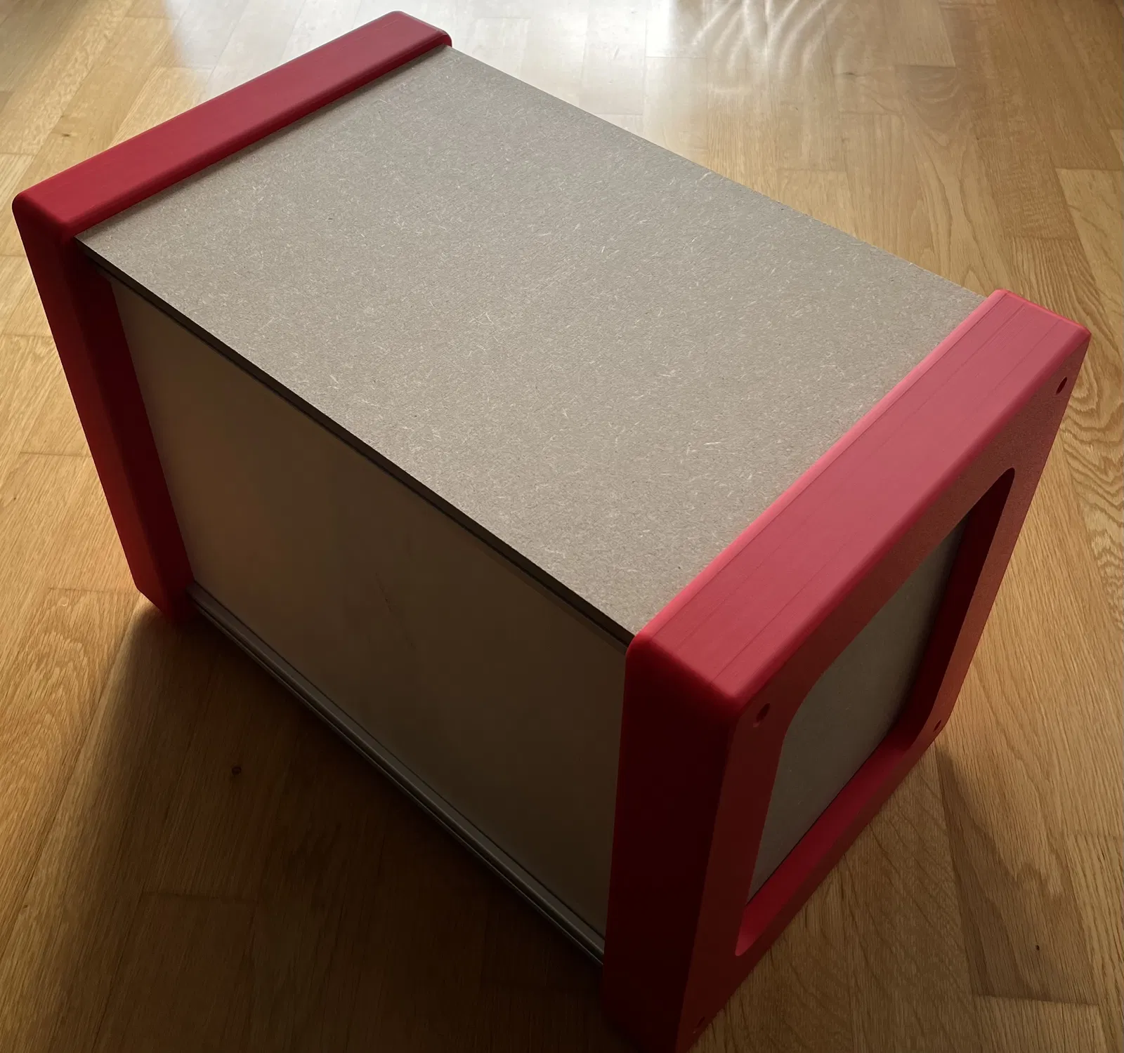 Mẫu này cần máy in khổ lớn; bản in trong hình là 35x30cm (tầm 1.1kg filament với thiết lập in PLA khá tiêu chuẩn). Hai tấm hông được bắt bằng 8x insert ren nhiệt M4 (threaded heat-set insert) và vít M4 (mình có kèm file in cho tấm hông dày 3mm, nhưng cá nhân mình dùng MDF bọc vải cho tất cả các mặt). Các tấm còn lại có thể ép/trượt vào rãnh của extrusion, hoặc bắt vít trực tiếp vào extrusion tùy bạn. Thanh 2020 extrusion được cố định bằng vít M5 hoặc M6. Mặt lưng có sẵn lỗ để bắt treo vào tường. Chân cao su (tùy chọn & in riêng) có thể dán keo vào.