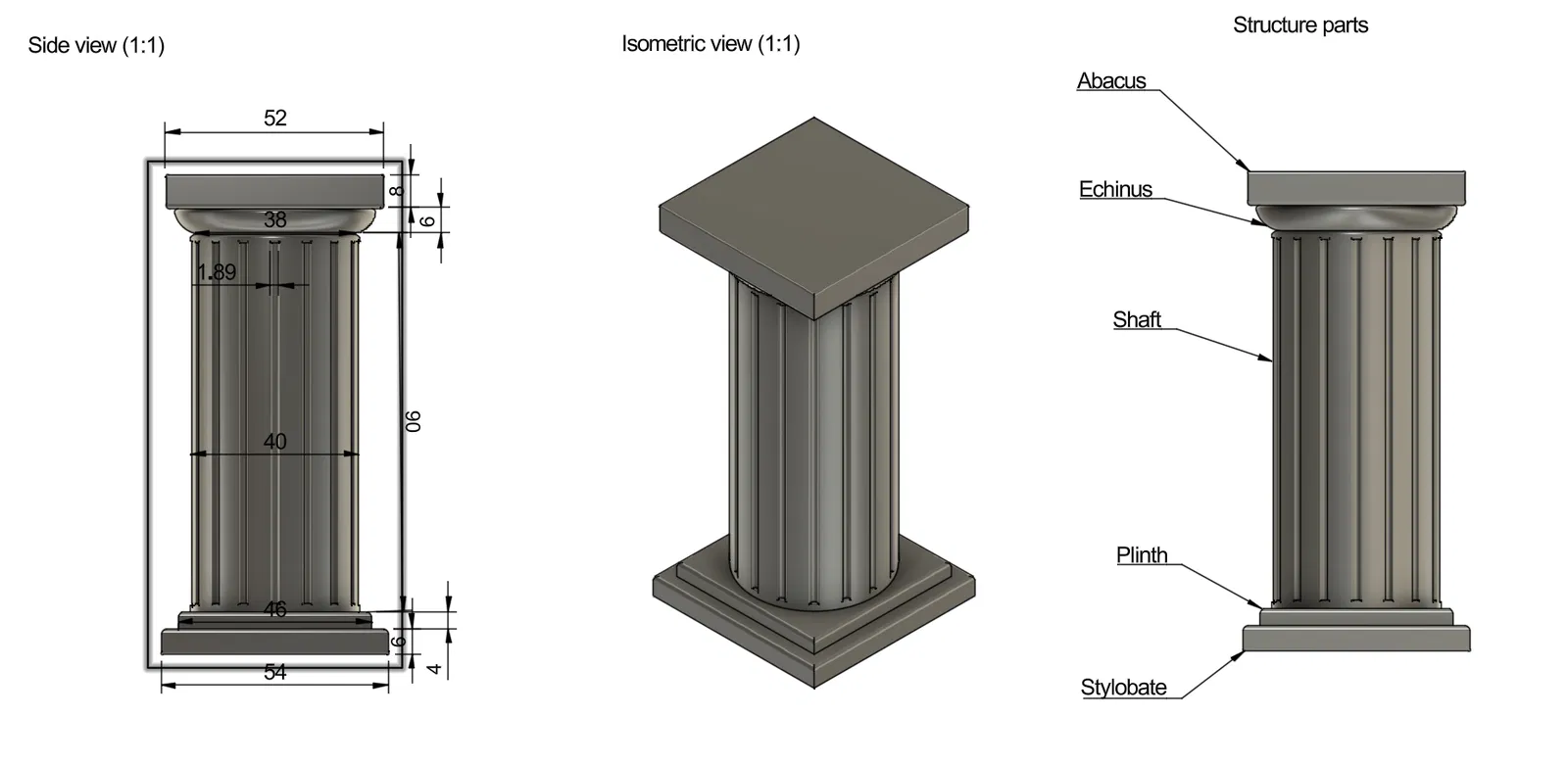 Tất cả phiên bản đều có thân cột dạng rãnh (fluted), phần echinus bo tròn và abacus vuông, đúng theo nguyên tắc thiết kế Greek/Roman truyền thống.