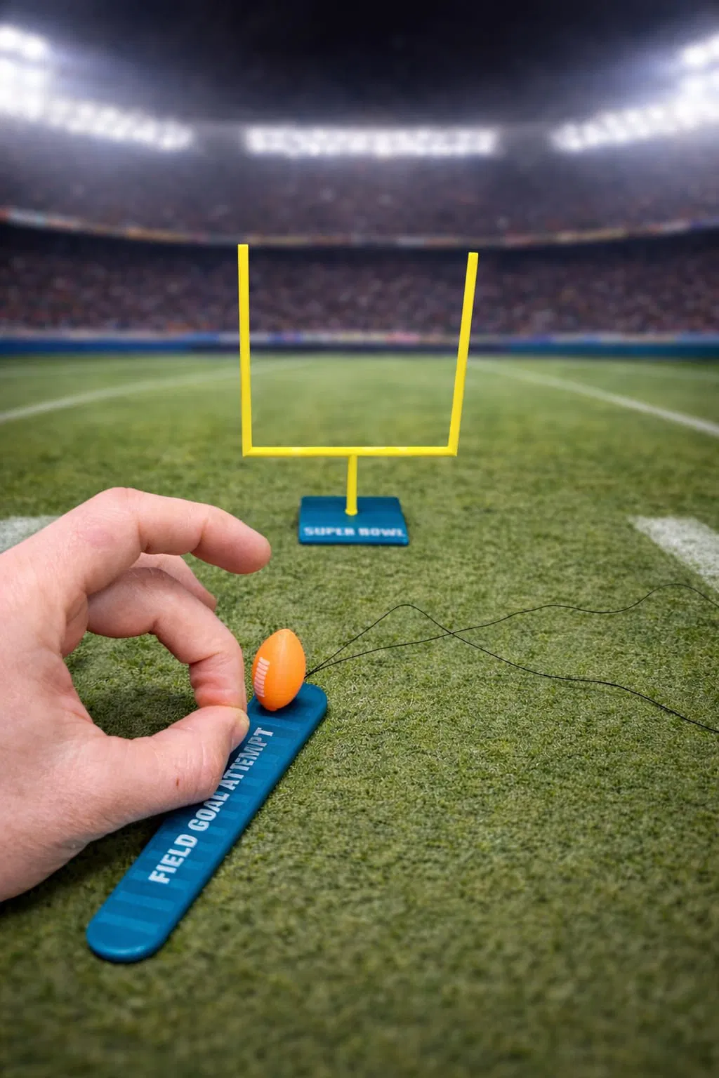 Trò chơi American football SUPER BOWL để bàn in 3D bằng FDM. Model chia nhiều chi tiết rời, dễ lắp ráp. Chỉ cần đặt bóng lên đế rồi búng ngón tay cho bóng bay qua goalposts để ghi điểm, chơi vui nhẹ nhàng.