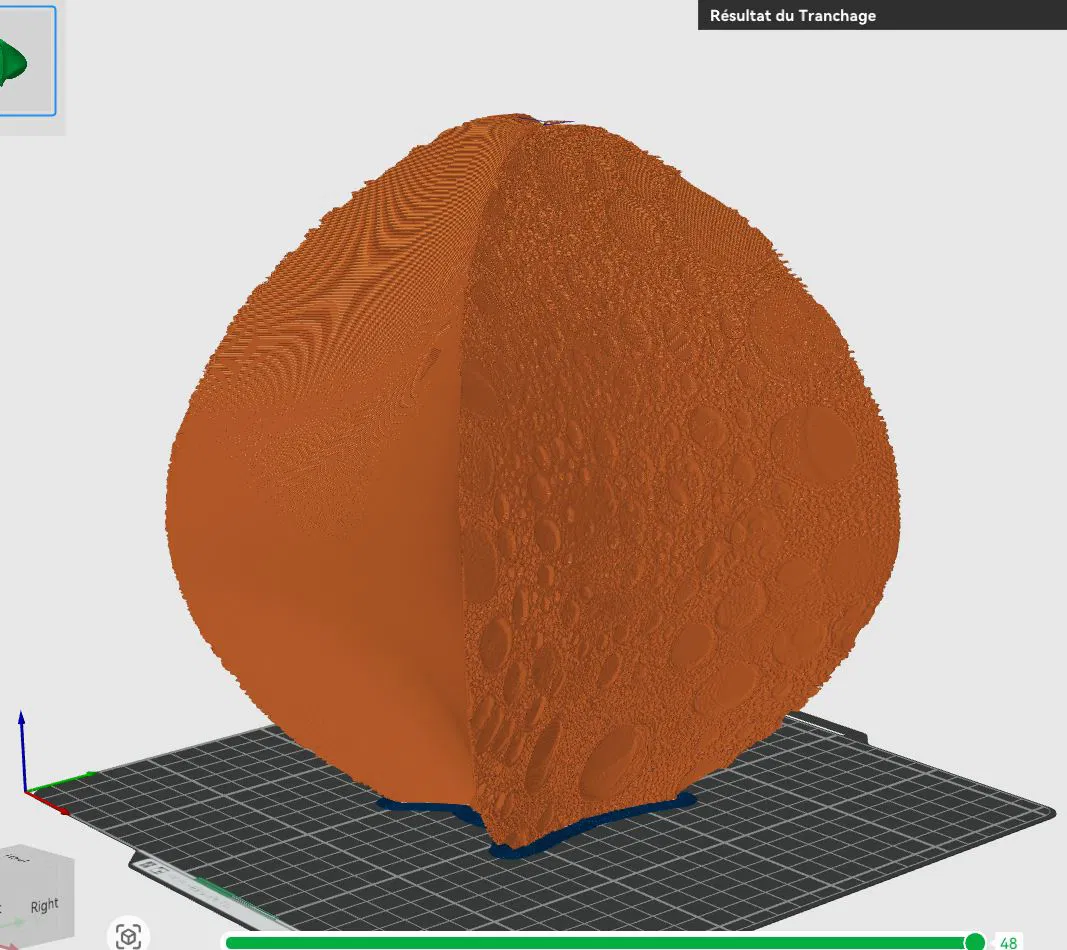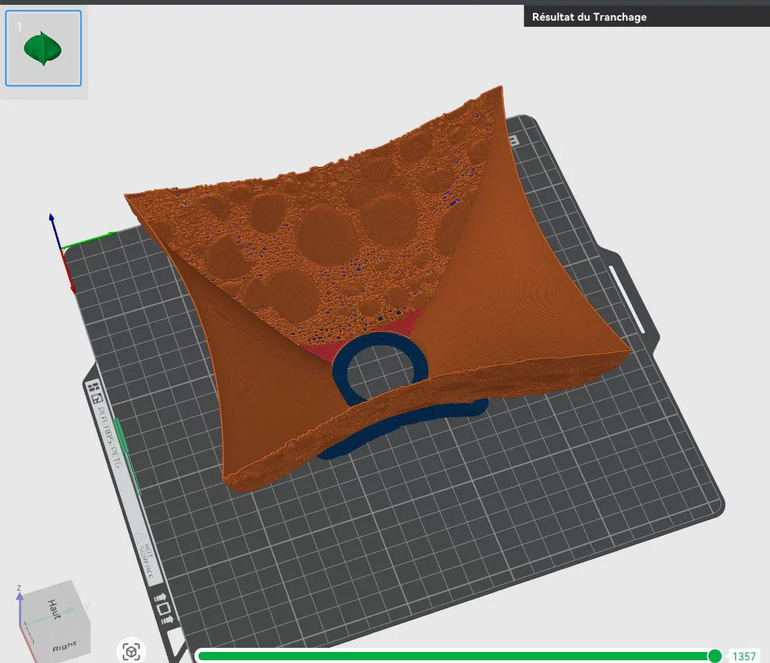 Trong lúc in, bạn sẽ thấy có hiện tượng lệch giữa 2 lớp ở phần bề mặt có texture. Lý do là mình đã chủ động “ép” độ nổi (relief) ở khu vực này. Dù bề mặt không “kín” theo đúng nghĩa đen, nhưng không ảnh hưởng tới ngoại hình và công năng của chụp đèn.