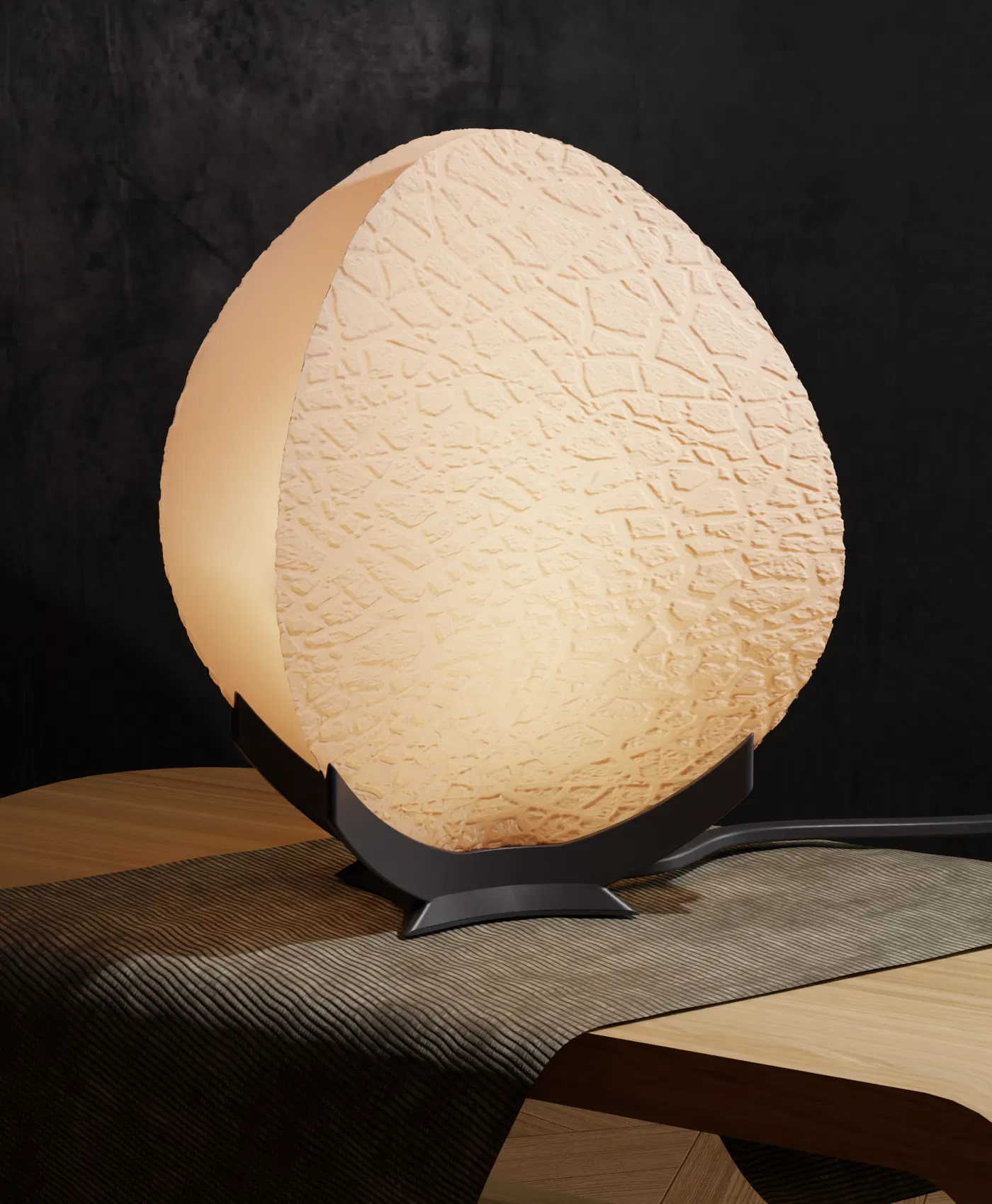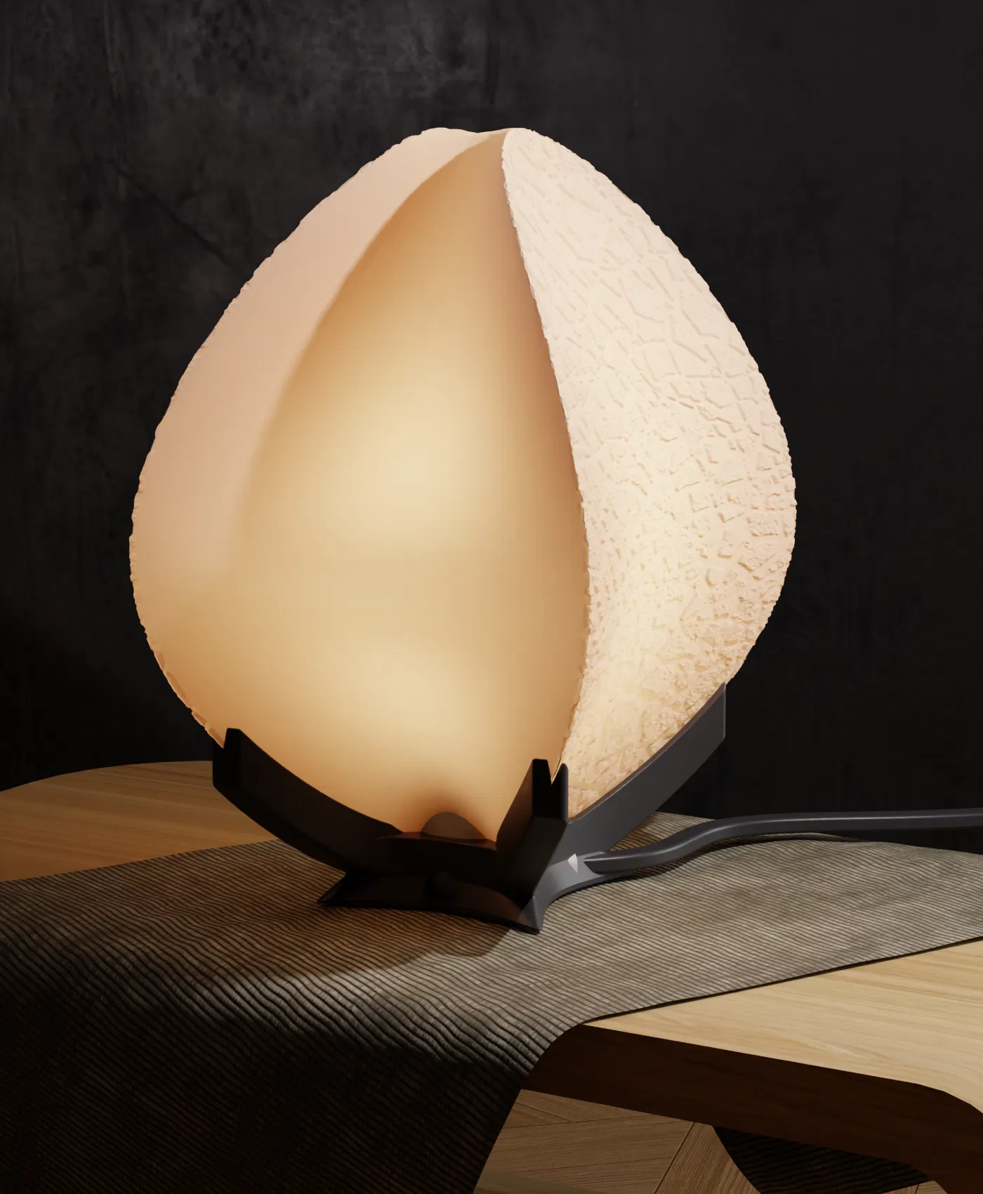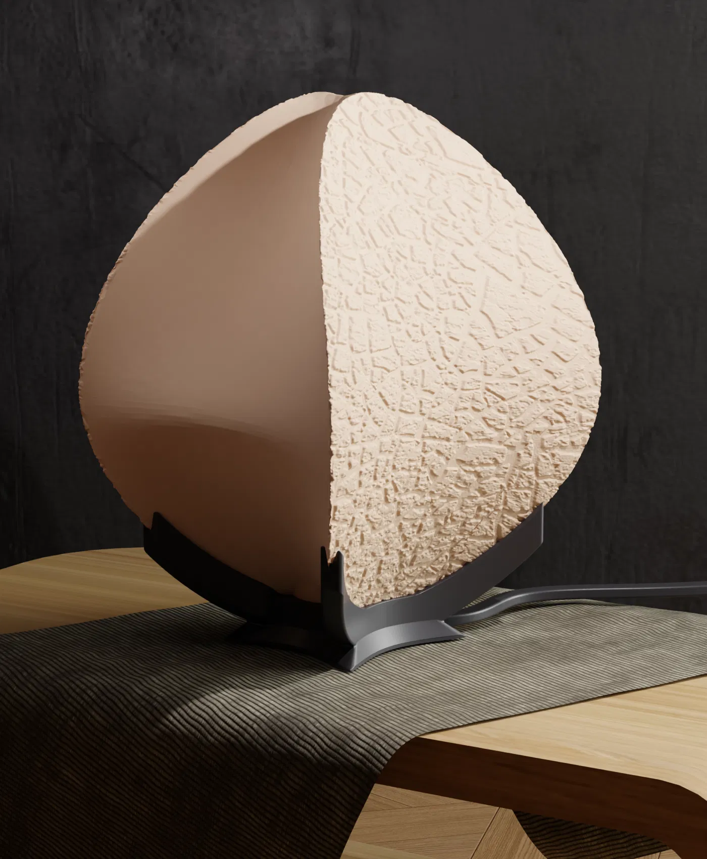 Chiếc đèn này là sự tổng hợp giữa phần mình làm về modeling và phần texturing trên Blender. Điểm đặc biệt là sự tương phản “hai mặt” giữa bề mặt trơn và bề mặt có texture trên phần chụp đèn (abat-jour). Chụp đèn có các cạnh sắc, tạo đường ranh rõ ràng giữa hai kiểu bề mặt.