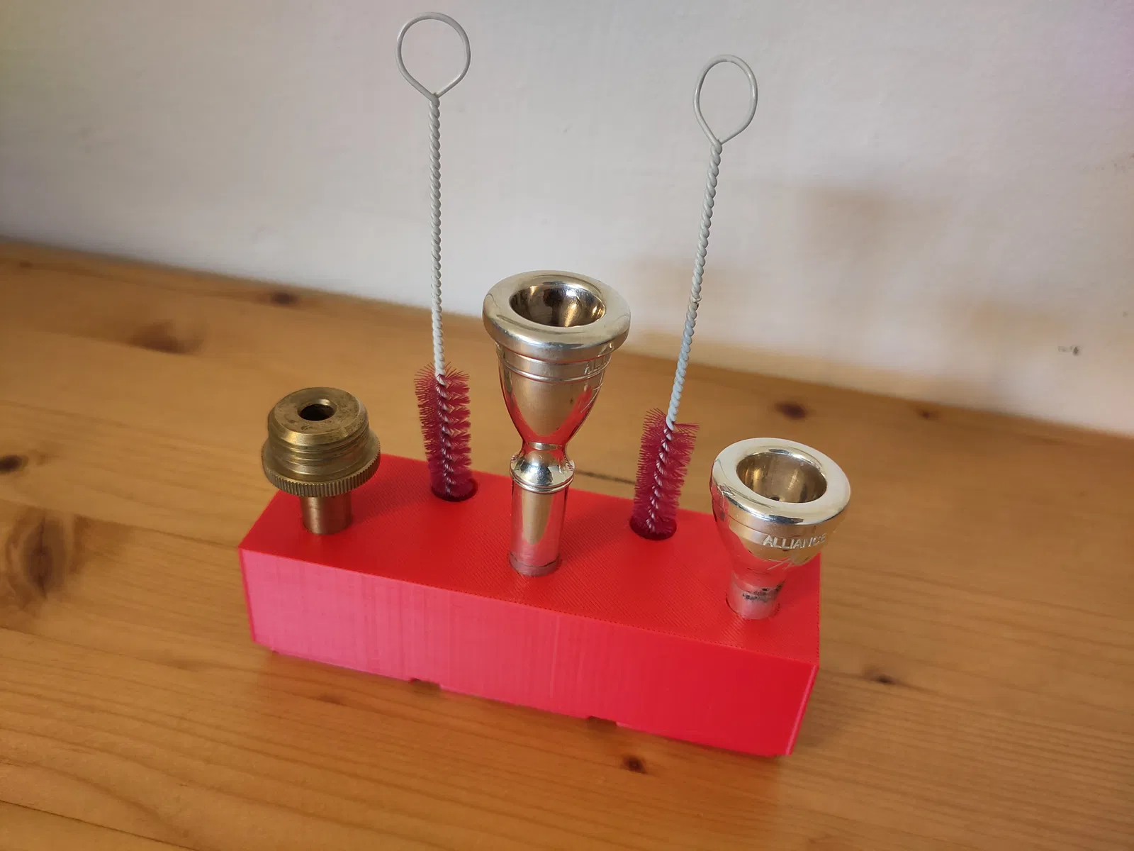 Khay 1x3 Gridfinity đựng tối đa 5 mouthpiece trumpet/flugelhorn hoặc phụ kiện vệ sinh (shower adapter, mouthpiece brush). Lỗ Ø11 mm; 3 lỗ nằm gọn trong box, dùng đủ 5 sẽ có 2 món nhô lên. In PLA, infill 10%.