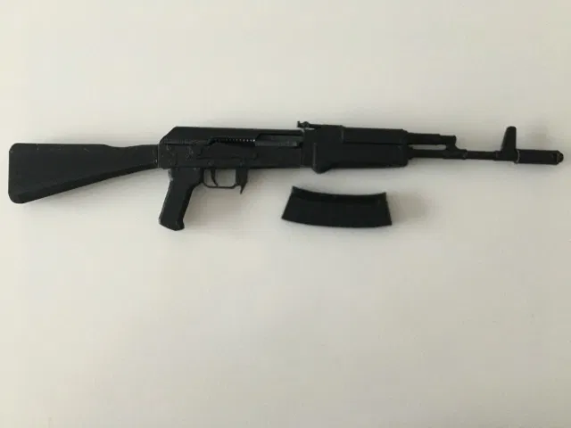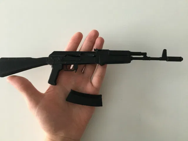 Mini mô hình AK-74M nhỏ gọn, có bolt (khóa nòng) chuyển động và băng đạn tháo rời. Khi lắp ráp cần thêm lò xo nhỏ lấy từ bút bi để bolt hồi về.