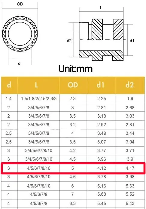 Dùng ốc chèn đồng (heat-set) M3, kích thước chính xác nằm ở hình cuối.