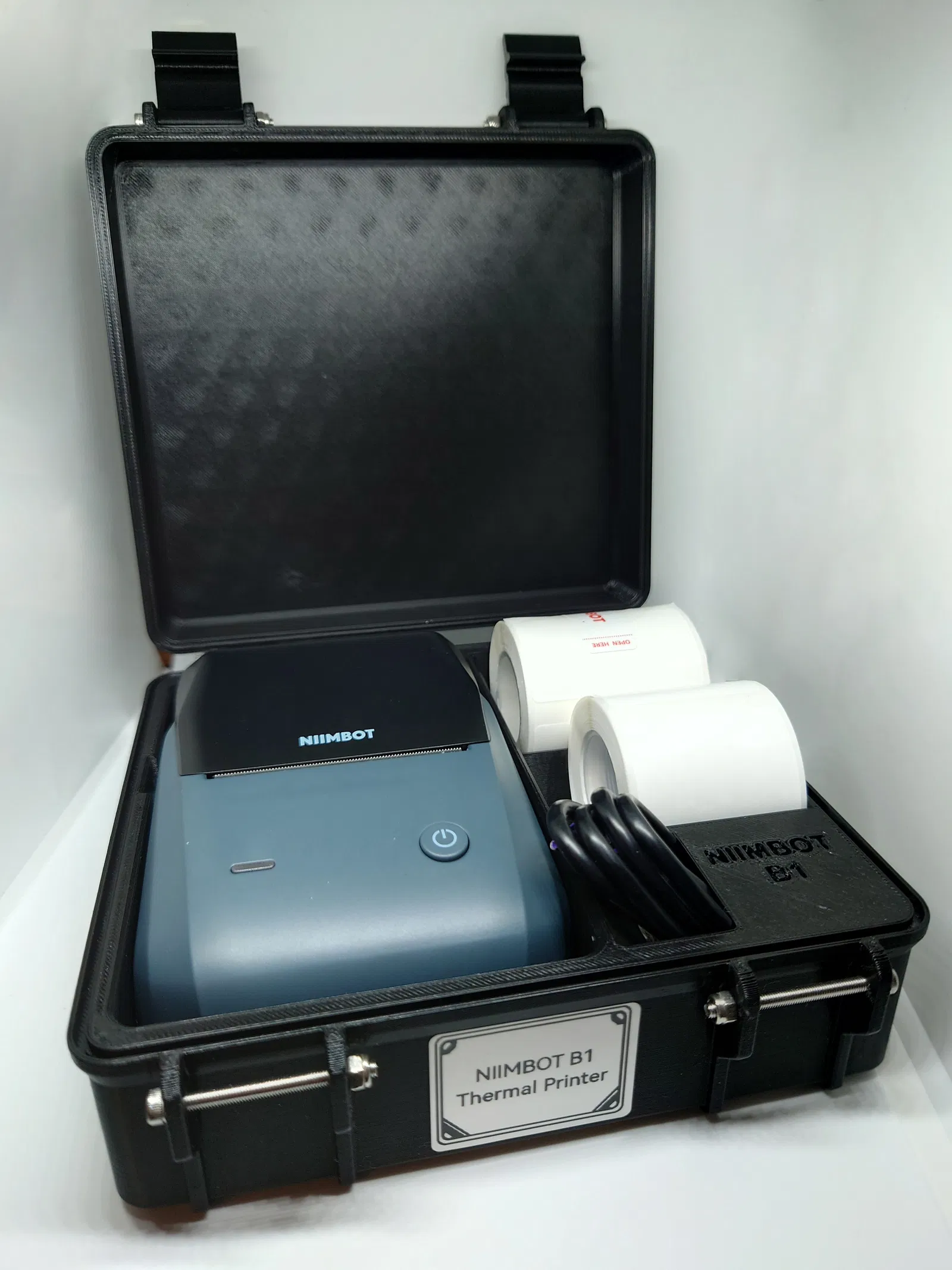 Hộp rugged để cất gọn máy in nhãn nhiệt Niimbot B1, dây USB-C đi kèm và tối thiểu 3 cuộn nhãn (tính cả cuộn trong máy). Lắp theo thiết kế gốc cần 6x M3x30; nếu dùng ê-cu thì nên chọn M3x35 + ê-cu M3.