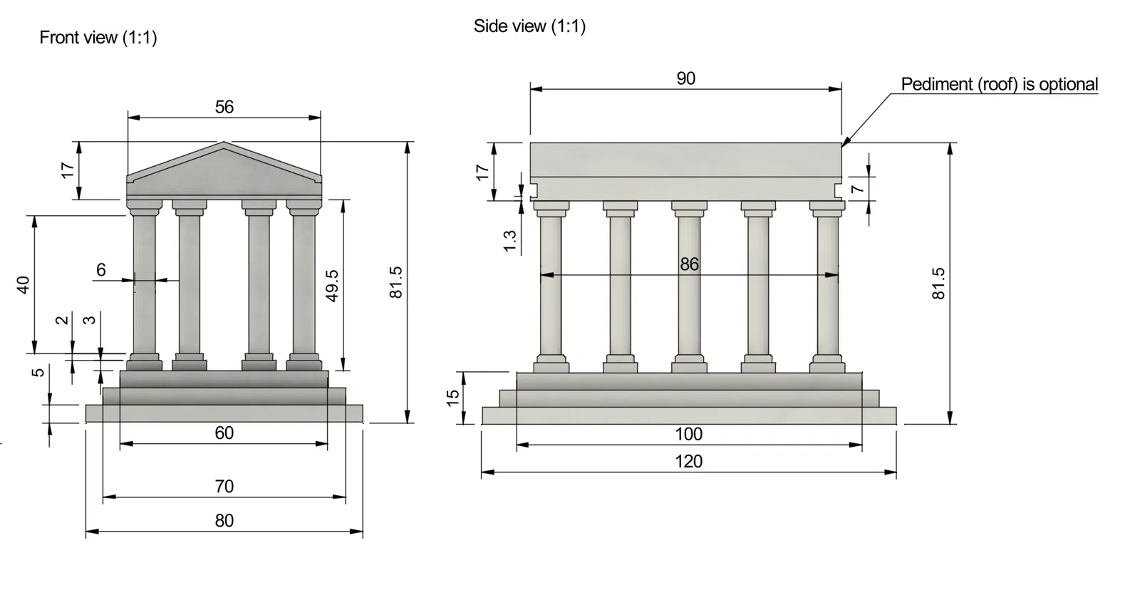 Ngôi đền là dạng modular, nên bạn có thể in có hoặc không có phần pediment (mái tam giác), tuỳ theo sở thích và cách set up máy in.