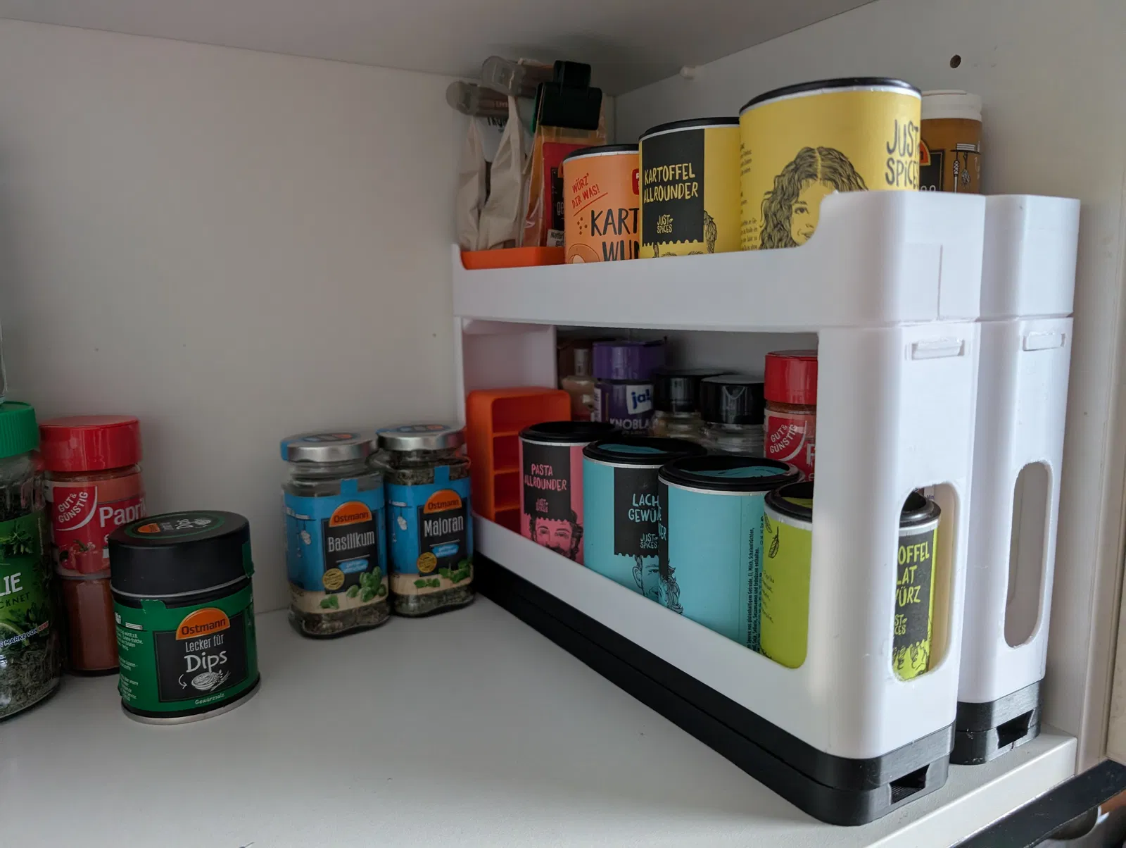 Kệ gia vị xoay với 2 bề rộng. Lắp ráp đơn giản, chỉ cần vít 3x16mm và có thể cần thêm keo ở một điểm. Khuyến nghị in slider bằng PETG để đủ độ cứng, hạn chế tháo lắp nhiều lần.