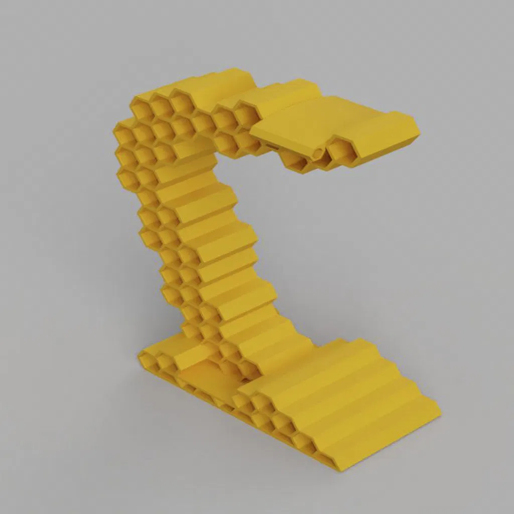 Bản redesign của Honeycomb headphone stand: lục giác chồng lấp cho độ dày tường đồng đều, đế nhìn “nhẹ” hơn và khớp dán trụ–đế chặt hơn. Kích thước giữ nguyên, vừa bed PRUSA, hợp tai nghe lớn.