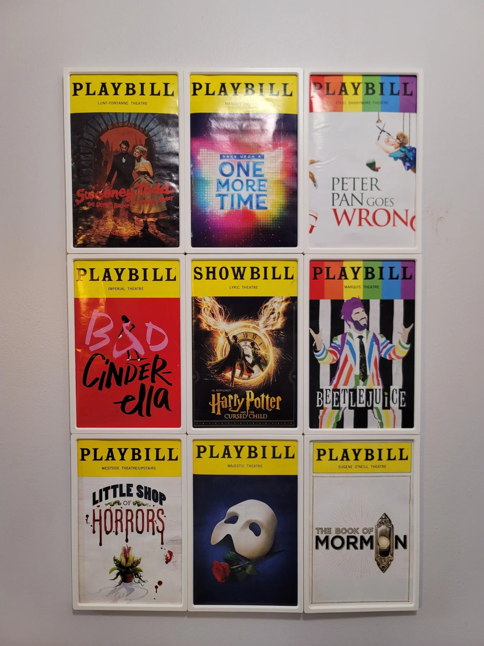 Đây là khung 2 phần phù hợp được thiết kế để treo Playbills. Nó có kích thước cho NY Broadway Playbills, có tính đến các biến thể nhỏ giữa 9 tôi có trong tay. Tôi không chắc kích thước này có phổ biến trên phạm vi quốc tế không, nhưng vui lòng chia sẻ kết quả của bạn nếu những người khác phù hợp.
