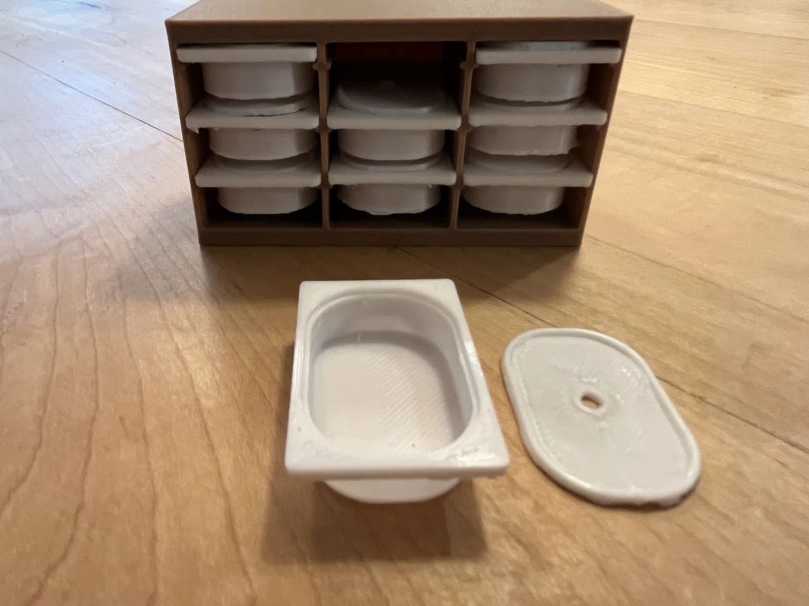 Bản Remix mô hình IKEA TROFAST tỉ lệ 1:12 cho dollhouse, mình thiết kế lại các khay nhỏ để nhìn thật hơn. Khi in, dùng wood PLA cho tủ và white PLA cho khay cùng phần nắp/top.
