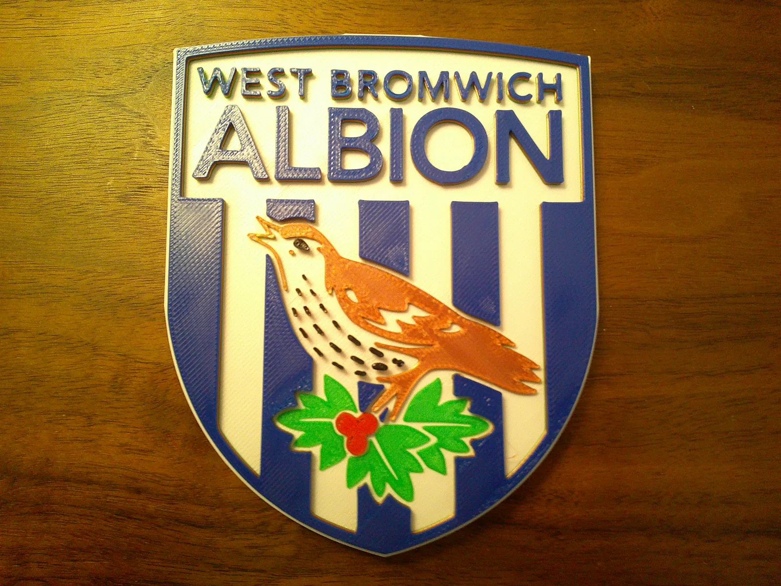 Mẫu lót ly hoặc plaque logo West Bromwich Albion F.C., phù hợp in 3D nhiều màu theo từng lớp. Gợi ý đổi filament theo độ cao: trắng 4.8mm, xanh lá 5.2mm, nâu 5.8mm, đỏ 6.2mm, xanh dương 6.8mm, kết thúc đen.