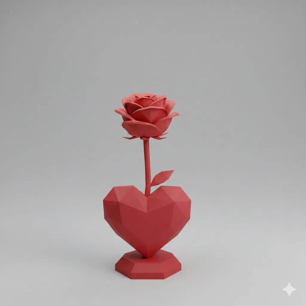 Mẫu hoa hồng low-poly đặt trên đế trái tim sang trọng, hợp trang trí Valentine, kỷ niệm hay tiệc cưới. In nhanh khoảng 45 phút, dễ scale 50–150%, phù hợp PLA đỏ hoặc Silk PLA.